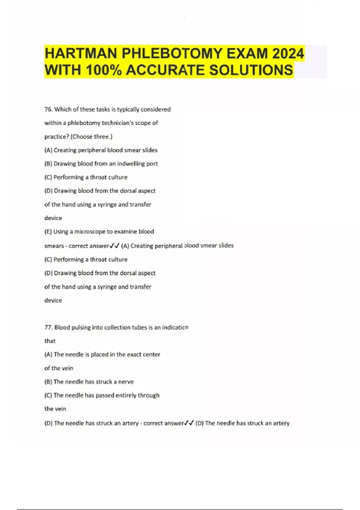 HARTMAN PHLEBOTOMY EXAM 2024 WITH 100% ACCURATE SOLUTIONS 76. Which of these tasks is typically considered within a phlebotomy technician's scope of practice? (Choose three.) (A) Creating peripheral blood smear slides (B) Drawing blood from an indwelling port (C) Performing a throat culture (D) Drawing blood from the dorsal aspect of the hand using a syringe and transfer device (E) Using a microscope to examine blood smears - correct answer (A) Creating peripheral blood smear slides (C) Performing a throat culture (D) Drawing blood from the dorsal aspect of the hand using a syringe and transfer device 77. Blood pulsing into collection tubes is an indication that (A) The needle is placed in the exact center of the vein