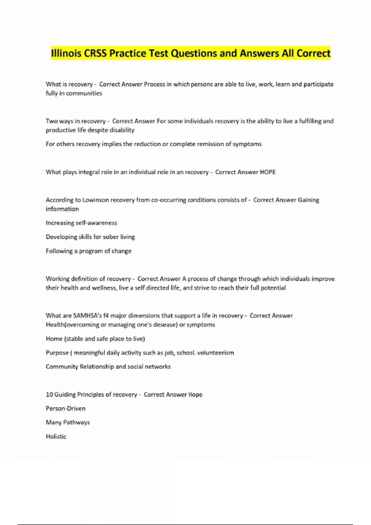 Illinois CRSS Practice Test Questions and Answers All Correct What is recovery - Correct Answer Process in which persons are able to live, work, learn and participate fully in communities Two ways in recovery - Correct Answer For some individuals recovery is the ability to live a fulfilling and productive life despite disability For others recovery implies the reduction or complete remission of symptoms What plays integral role in an individual role in an recovery - Correct Answer HOPE According to Lowinson recovery from co-occurring conditions consists of - Correct Answer Gaining information Increasing self-awareness Developing skills for sober living Following a program of change Working definition of recovery - Correct Answer A process of change through which individuals improve