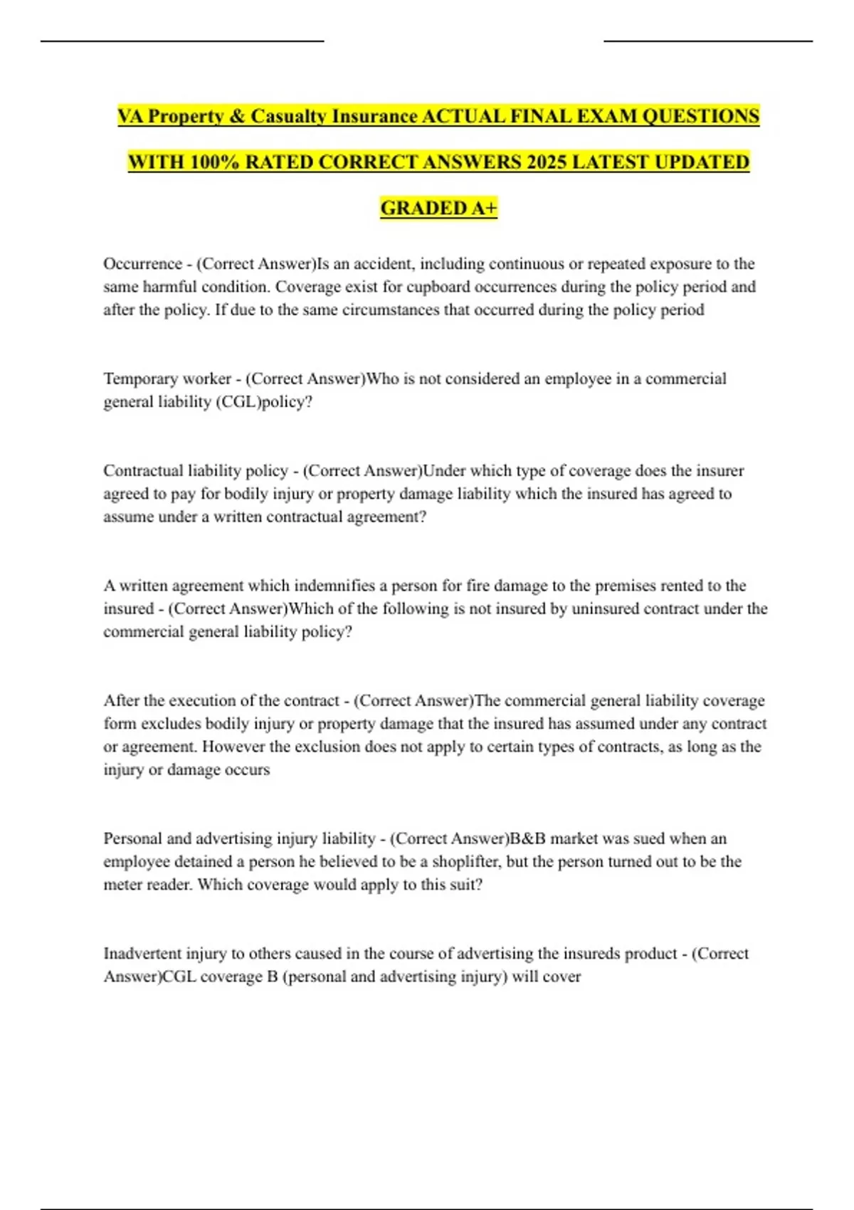 VA Property & Casualty Insurance ACTUAL FINAL EXAM QUESTIONS WITH 100% RATED CORRECT ANSWERS 2025 LATEST UPDATED GRADED A+