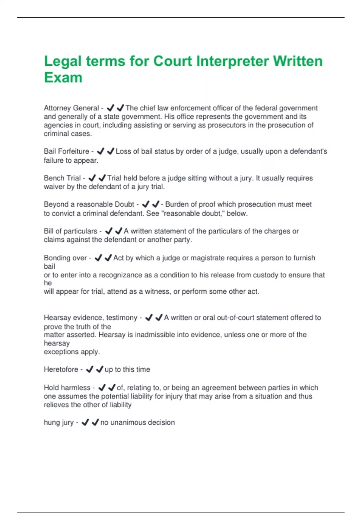 Bench Trial - ✔️✔️Trial held before a judge sitting without a jury. It usually requires