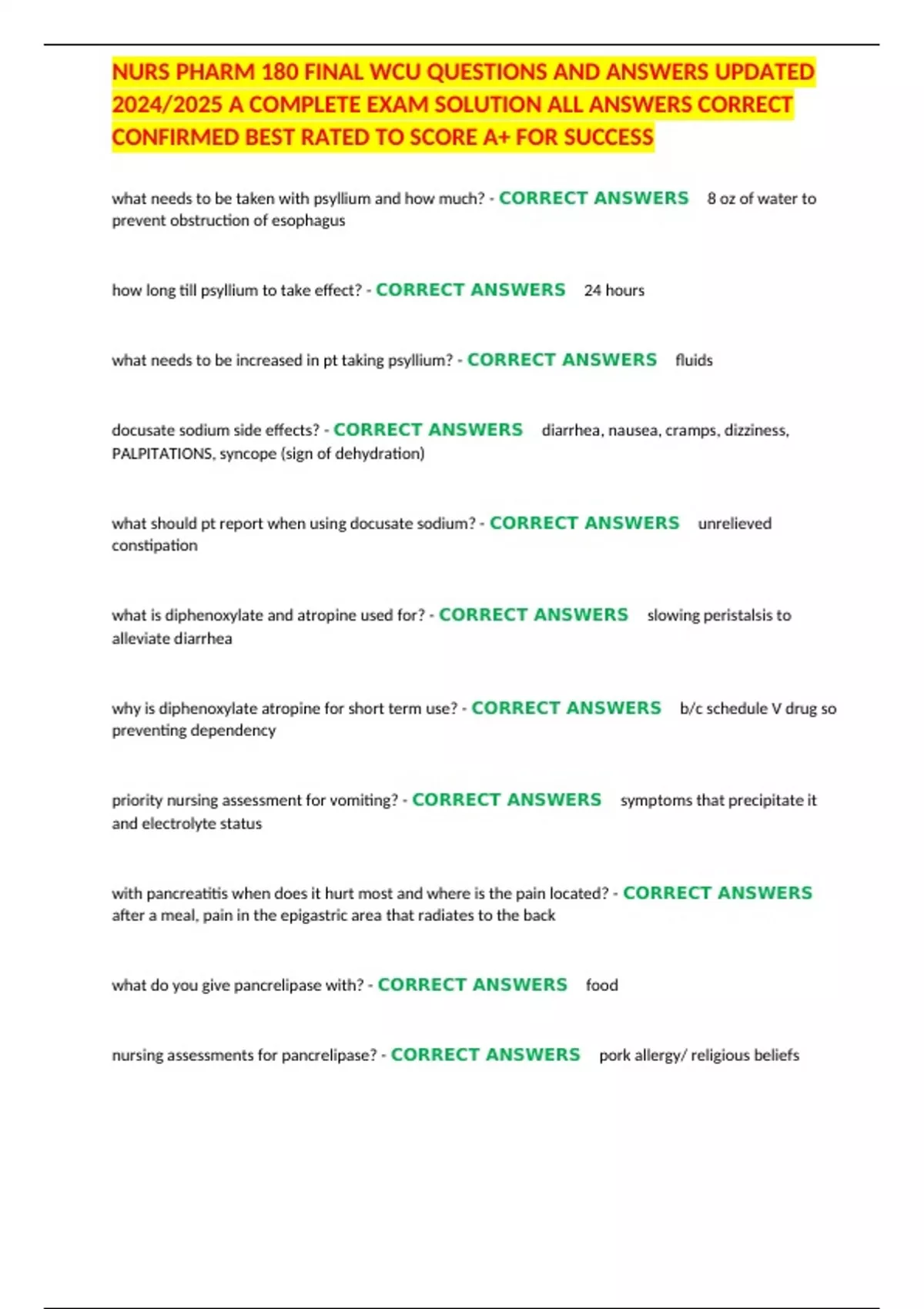, NURS PHARM 180 FINAL WCU QUESTIONS AND ANSWERS UPDATED
