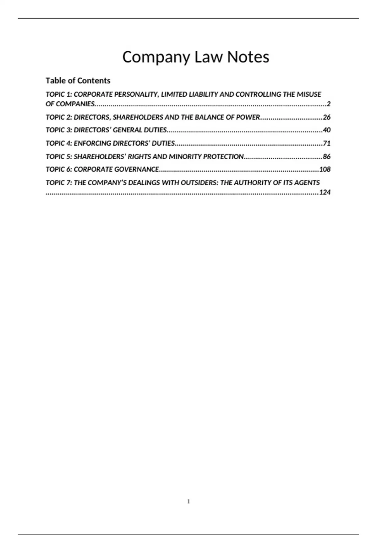 First Class Company Law Notes covering: TOPIC 1: CORPORATE PERSONALITY, LIMITED LIABILITY AND CONTROLLING THE MISUSE OF COMPANIES TOPIC 2: DIRECTORS, SHAREHOLDERS AND THE BALANCE OF POWER TOPIC 3: DIRECTORS’ GENERAL DUTIES TOPIC 4: ENFORCING DIRECTORS’ DUTIES TOPIC 5: SHAREHOLDERS’ RIGHTS AND MINORITY PROTECTION TOPIC 6: CORPORATE GOVERNANCE TOPIC 7: THE COMPANY’S DEALINGS WITH OUTSIDERS: THE AUTHORITY OF ITS AGENTS