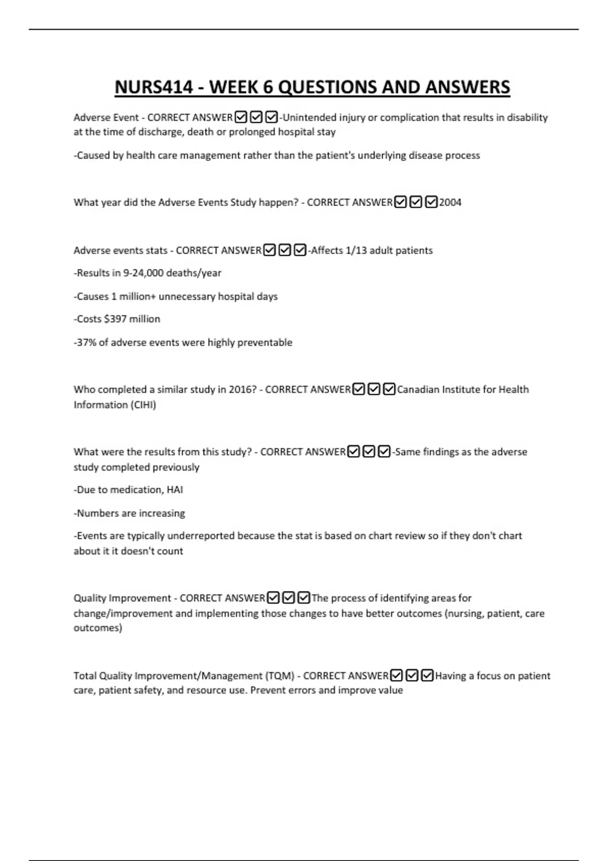 NURS414 - WEEK 6 QUESTIONS AND ANSWERS Adverse Event - CORRECT ANSWER-Unintended injury or complication that results in disability at the time of discharge, death or prolonged hospital stay -Caused by health care management rather than the patient's underlying disease process