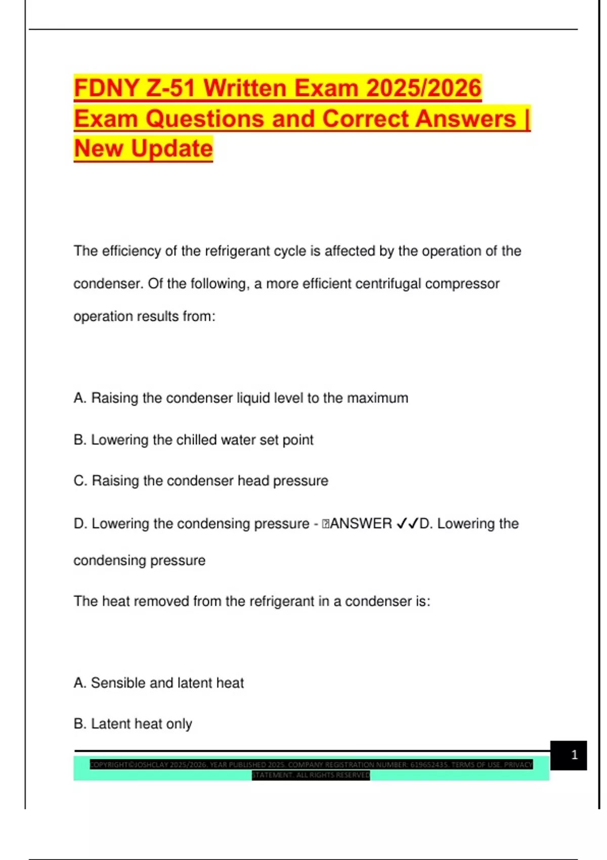 FDNY Z-51 Written Exam 2025/2026 Exam Questions and Correct Answers | New Update The efficiency of the refrigerant cycle is affected by the operation of the condenser. Of the following, a more efficient centrifugal compressor operation results from: A. Raising the condenser liquid level to the maximum B. Lowering the chilled water set point C. Raising the condenser head pressure D. Lowering the condensing pressure -