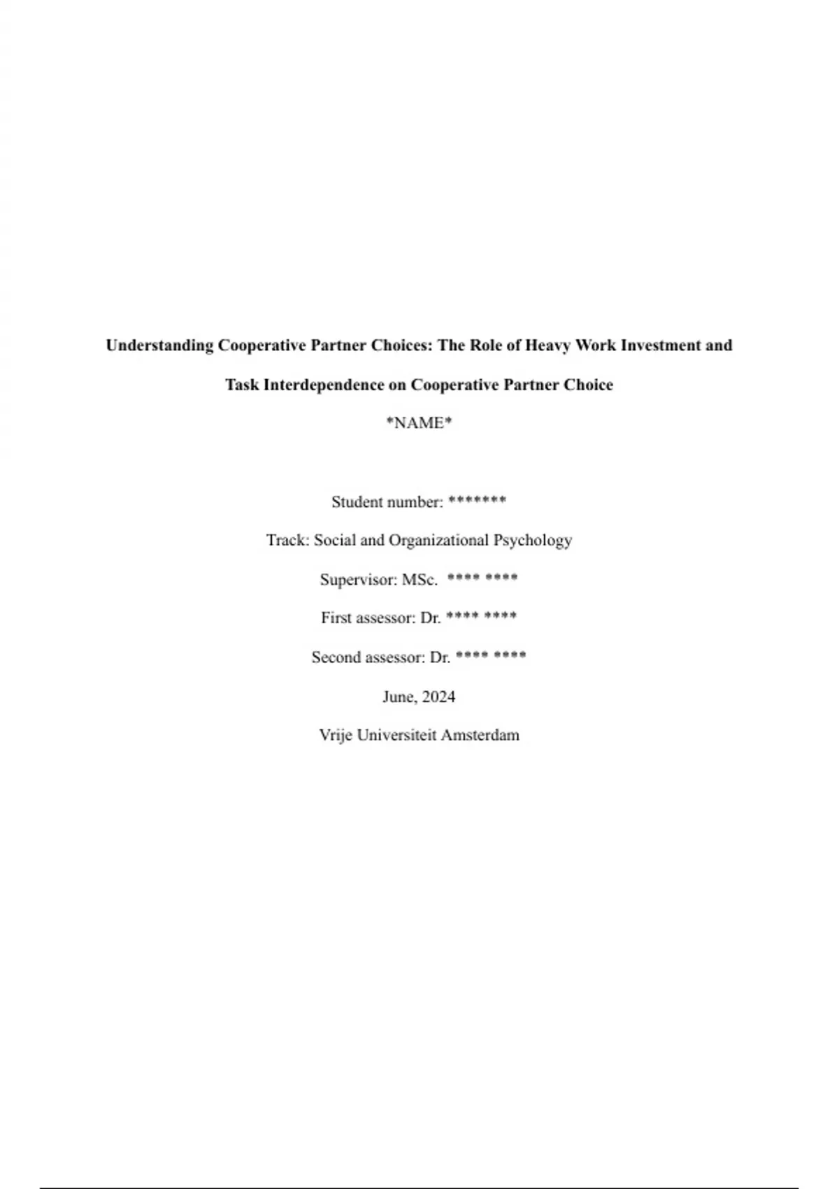 Here is my thesis for the Bachelor Psychology, focused on Social and Organisational Psychology. The study investigates the influence of Heavy Work Investment (HWI) and task interdependence on Cooperative Partner Choice (CPC) within an organisation. It was graded with an 8! Using this as an example for your thesis could be helpful! Good Luck :)