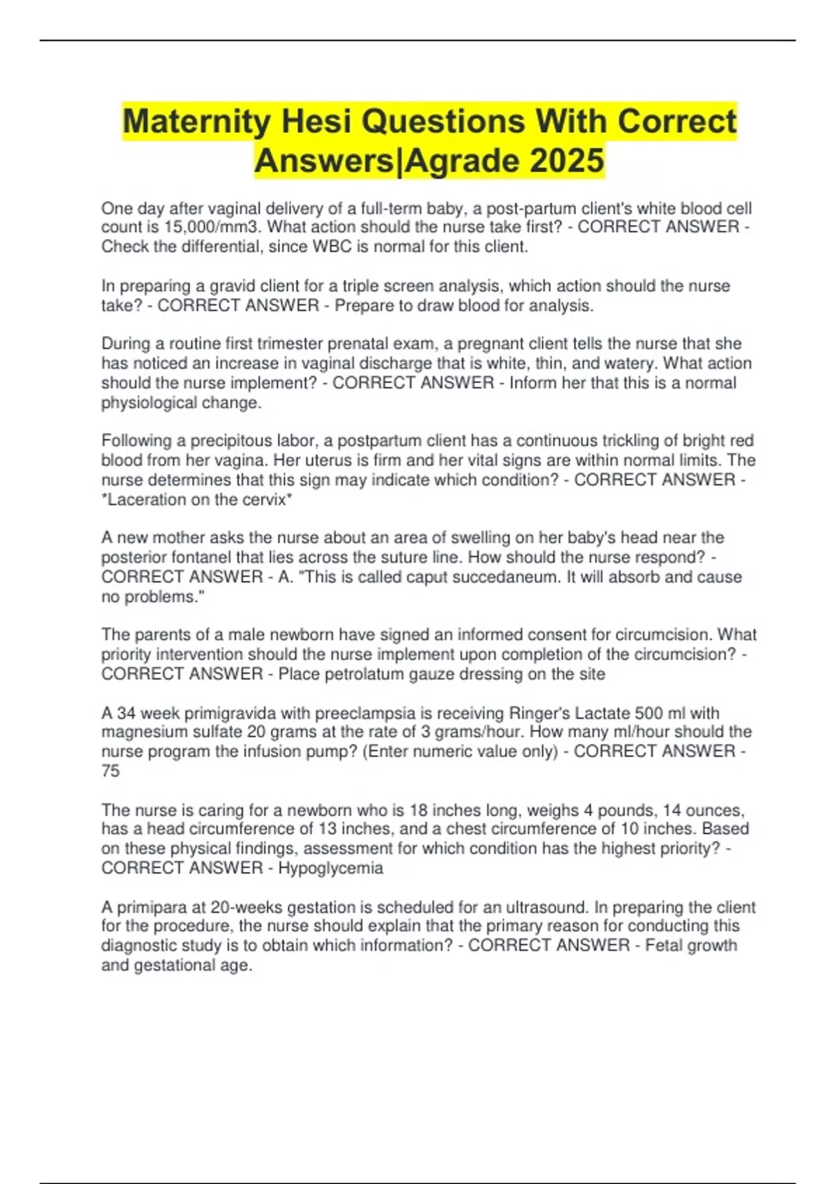 Maternity Hesi Questions With Correct Answers|Agrade 2025
