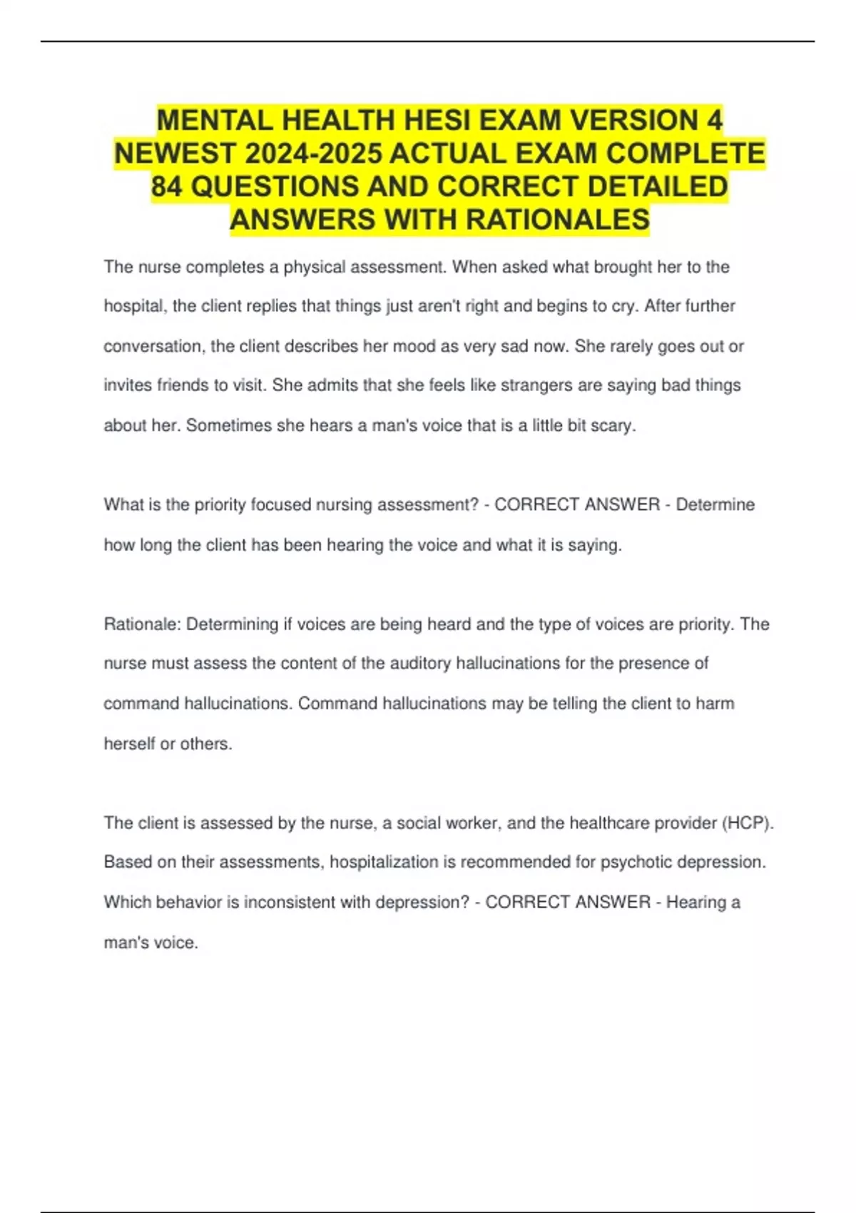 MENTAL HEALTH HESI EXAM VERSION 4 NEWEST ACTUAL EXAM COMPLETE 84 QUESTIONS AND CORRECT DETAILED ANSWERS WITH RATIONALES
