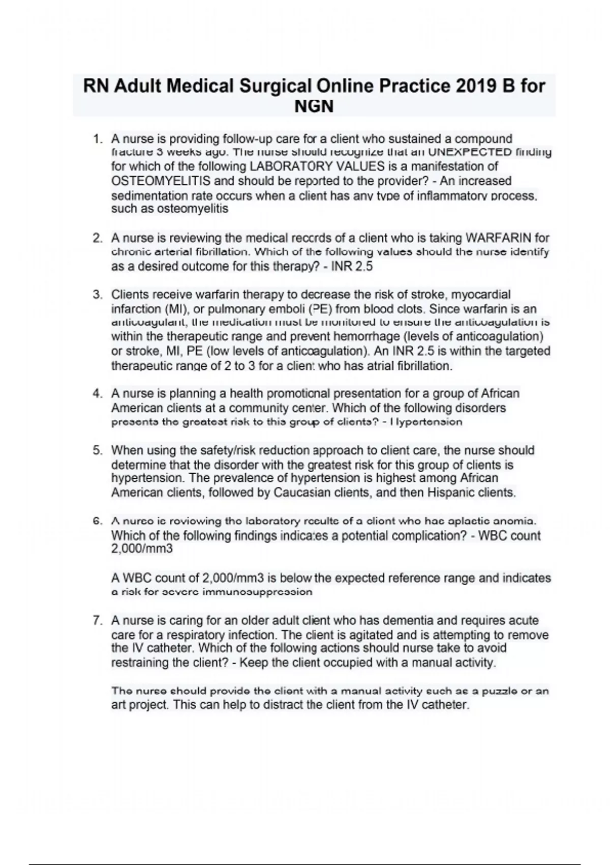 1. A nurse is providing follow-up care for a client who sustained a compound fracture 3 weeks ago. The nurse should recognize that an UNEXPECTED finding for which of the following LABORATORY VALUES is a manifestation of OSTEOMYELITIS and should be reported to the provider? - An increased sedimentation rate occurs when a client has any type of inflammatory process, such as osteomyelitis 2. A nurse is reviewing the medical records of a client who is taking WARFARIN for chronic arterial fibrillation. Which of the following values should the nurse identify as a desired outcome for this therapy? - INR 2.5 3. Clients receive warfarin therapy to decrease the risk of stroke, myocardial infarction (MI), or pulmonary emboli (PE) from blood clots. Since warfarin is an anticoagulant, the medication must be monitored to ensure the anticoagulation is within the therapeutic range and prevent hemorrhage (levels of anticoagulation) or stroke, MI, PE (low levels of anticoagulation). An INR 2.5 is within the targeted therapeutic range of 2 to 3 for a client who has atrial fibrillation. 4. A nurse is planning a health promotional presentation for a group of African American clients at a community center. Which of the following disorders presents the greatest risk to this group of clients? - Hypertension 5. When using the safety/risk reduction approach to client care, the nurse should determine that the disorder with the greatest risk for this group of clients is hypertension. The prevalence of hypertension is highest among African American clients, followed by Caucasian clients, and then Hispanic clients. 6. A nurse is reviewing the laboratory results of a client who has aplastic anemia. Which of the following findings indicates a potential complication? - WBC count 2,000/mm3 A WBC count of 2,000/mm3 is below the expected reference range and indicates a risk for severe immunosuppression 7. A nurse is caring for an older adult client who has dementia and requires acute care for a respiratory infection. The client is agitated and is attempting to remove the IV catheter. Which of the following actions should nurse take to avoid restraining the client? - Keep the client occupied with a manual activity. The nurse should provide the client with a manual activity such as a puzzle or an art project. This can help to distract the client from the IV catheter. 8. A nurse is planning care for a client who has a sealed radiation implant for cervical cancer. Which of the following interventions should the nurse include in the plan of care? - Keep a lead-lined container in the client's room The nurse should keep a lead-lined container and forceps in the client's room in case of accidental dislodgement of the implant. 9. A nurse reviewing the ABG results of a client who has advanced COPD. Which of the following results should the nurse expect? - PaCO2 56 mm Hg A client who has COPD retains PaCO2 duet to the weakening and the collapse of the alveolar sacs, which is decreases the area in the lings for gas exchange and causes the PaCO2 to increase above the expected reference range. 10. A nurse is assessing a client who has peripheral arterial disease. Which of the following findings should the nurse expect? - Hair loss on the lower legs The nurse should expect a client who has a peripheral arterial disease to have hair loss on the lower legs as a result of impaired arterial circulation affecting follicular growth. 11. A nurse is caring for a client who has breast cancer and tells the nurse that they would like to have acupuncture because it provides greater relief than pain medication Which of the following statements should the nurse make? - " I can speak to the provider about incorporating acupuncture into your treatment plan." The nurse should serve as an advocate for the client by acting on behalf of the client and offering to speak with the provider. The client has the right to make choices and decisions about their treatment and the nurse should support these decisions and assist the client to carry them out. 12. A nurse is providing teaching to a client who has hypertension and a NEW prescription for verapamil. Which of the following information should the nurse include in the teaching? - " Increase fiber intake to avoid constipation." The nurse should instruct the client that constipation is an adverse effect of verapamil. The client should increase fiber intake to promote regular bowel function. 13. A nurse is planning care for a client who is scheduled for a thoracentesis. Which of the following interventions should the nurse include in the plan? - Encourage the client to take deep breaths after the procedure After a thoracentesis, the client should deep breathe to re-expand the lung. 14. A nurse is reviewing the medical record of a client who has osteomyelitis and a prescription for gentamicin. Which of the following findings from the client's medical record should indicate to the nurse the need to withhold the medication and notify the provider? - Serum Creatinine A client who has an elevated serum creatinine level should not receive gentamicin because the medication is nephrotoxic. 15. A nurse is providing postoperative teaching for a client who had a total knee arthroplasty. Which of the following instructions should the nurse include? - Flex the foot every hour when awake The nurse should instruct the client to flex the foot every hour to reduce the risk for thromboembolism and promote venous return. 16. A nurse is teaching a group of newly licensed nurses about pain management for older adult clients. Which of the following statements by a newly licensed nurse indicates an understanding of the teaching? - "Ibuprofen can cause gastrointestinal bleeding in older adult clients." 17. A nurse is teaching a client about osteoporosis prevention. The nurse should instruct the client that which of the following medications can increase their risk for developing osteoporosis? - Prednisone The nurse should instruct the 