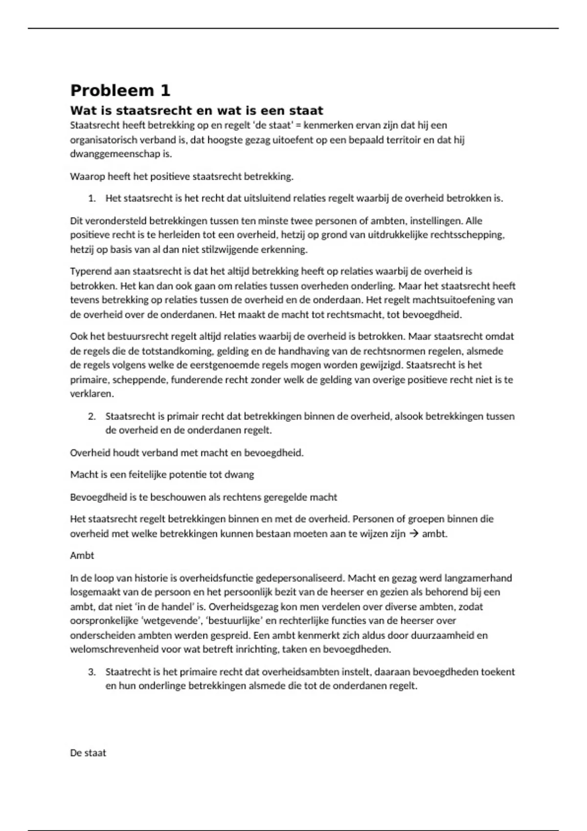 Deze uitgebreide en goed gestructureerde samenvatting behandelt de belangrijkste concepten en thema’s binnen het staatsrecht, zoals die aan bod komen in de bachelorfase van de rechtenstudie. De samenvatting is volledig afgestemd op de Grondwet en andere belangrijke wetgeving, met duidelijke uitleg van de werking van staatsorganen en de verhouding tussen de verschillende machten. Deze samenvatting is ideaal voor tentamenvoorbereiding en biedt een helder overzicht van de staatsrechtelijke theorieën en concepten die essentieel zijn voor het begrijpen van de structuur van de Nederlandse rechtsstaat. Daarnaast heb ik alle verplichte artikelen samengevat in dit document!