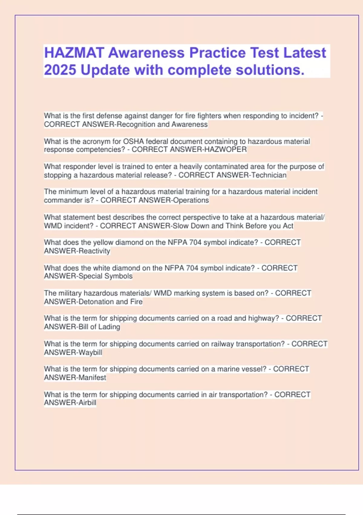 HAZMAT Awareness Practice Test Latest 2025 Update with complete solutions.
