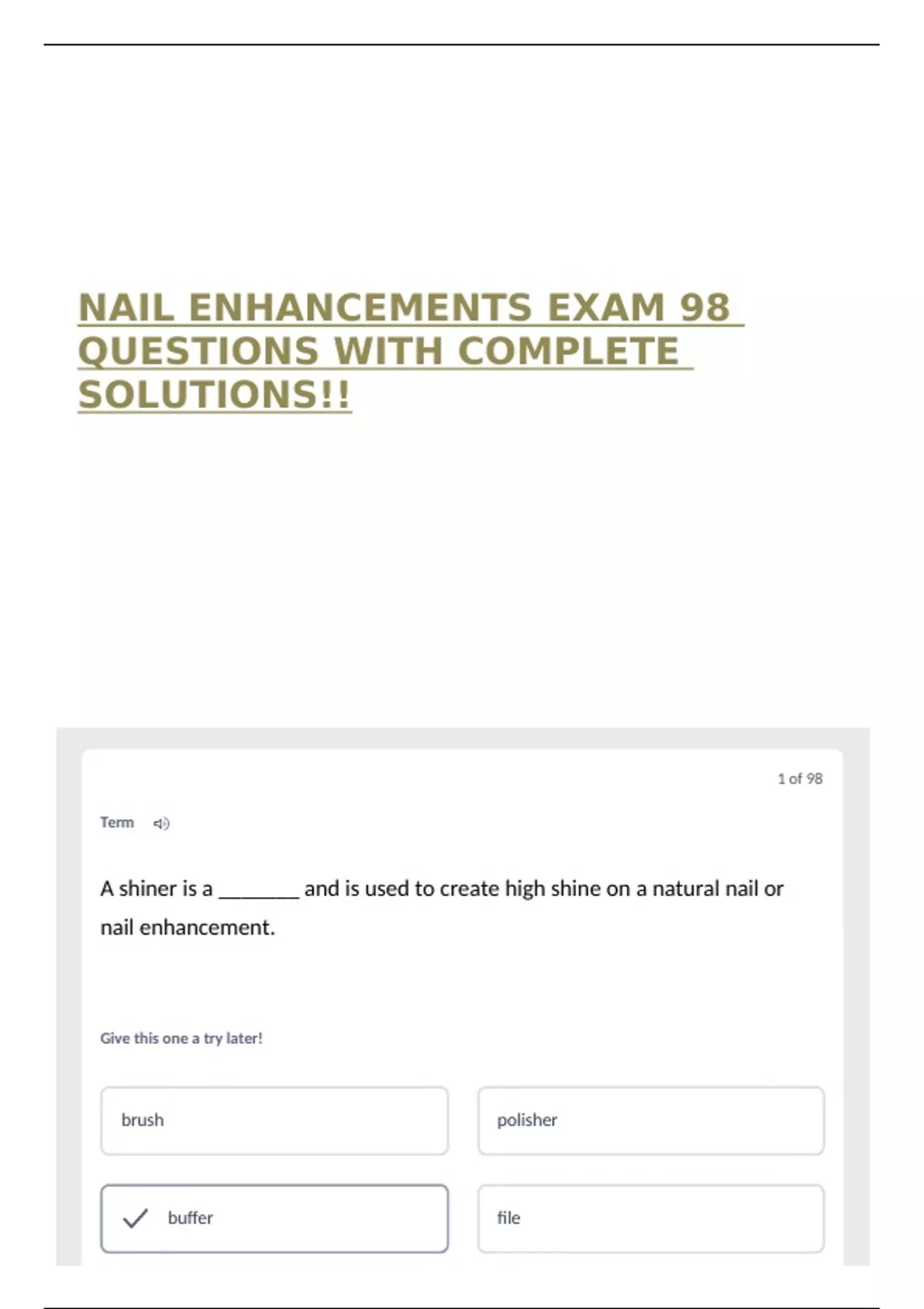 NAIL ENHANCEMENTS EXAM 98 QUESTIONS WITH COMPLETE SOLUTIONS!!
