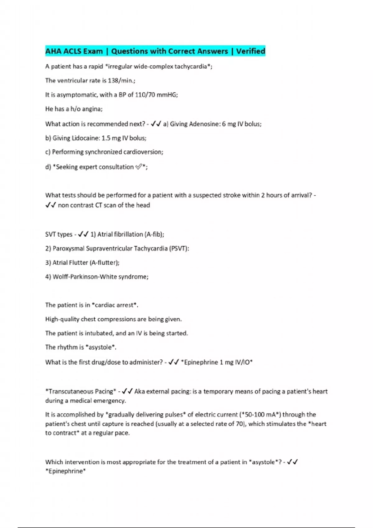 AHA ACLS Exam | Questions with Correct Answers | Verified