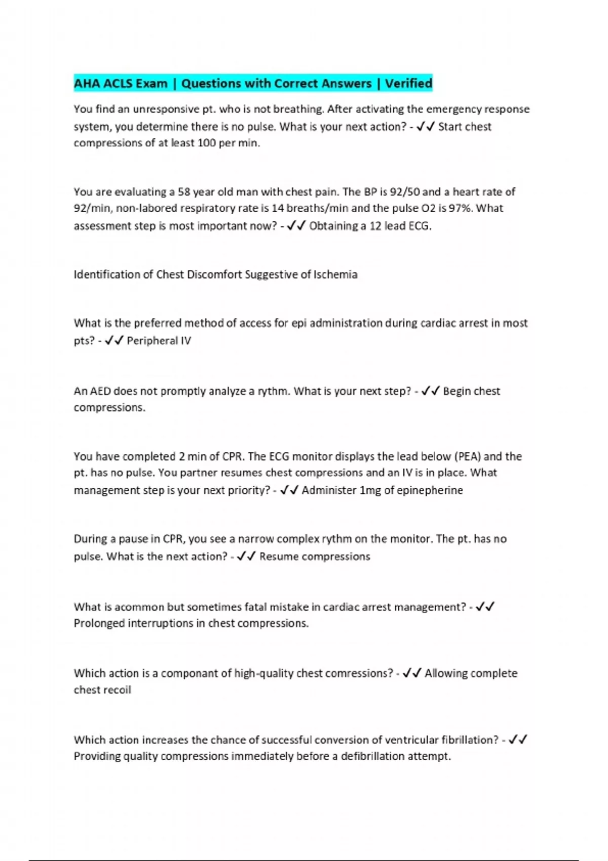 AHA ACLS Exam | Questions with Correct Answers | Verified