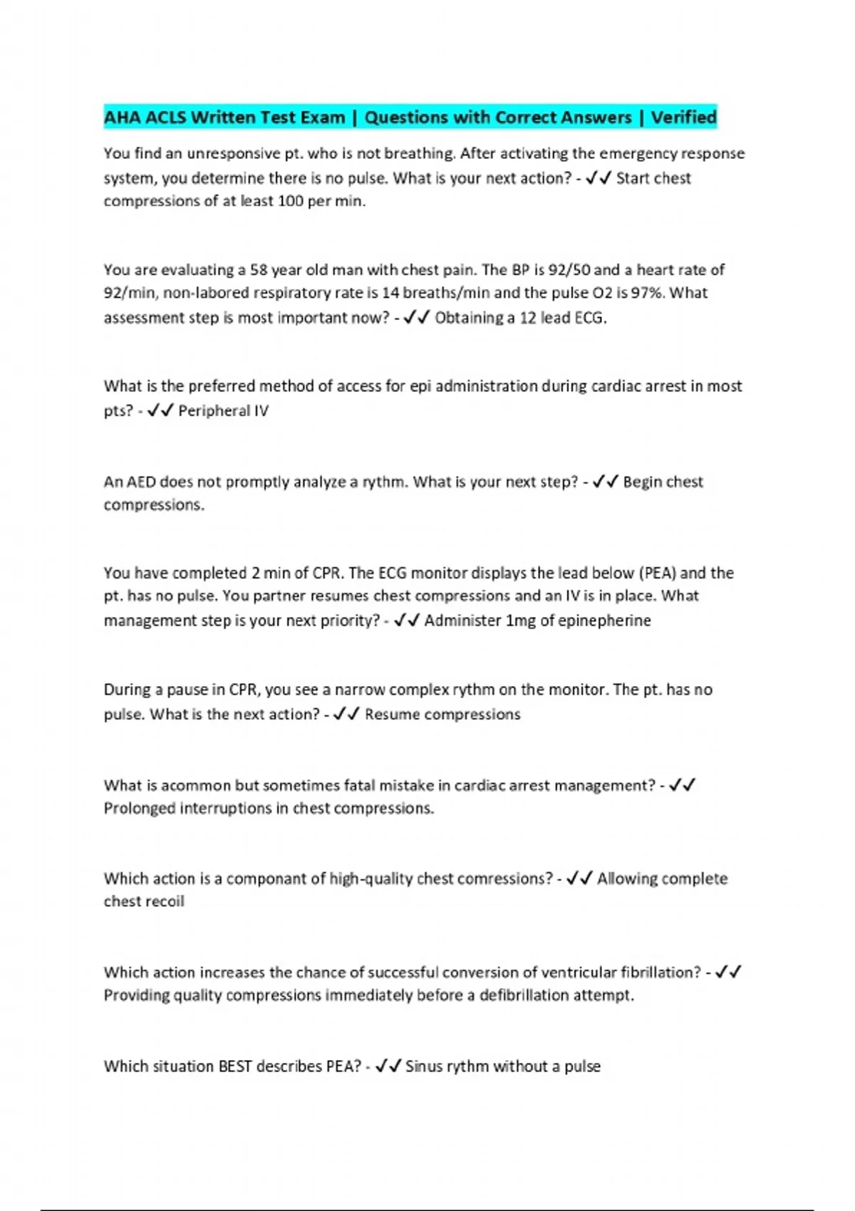 AHA ACLS Written Test Exam | Questions with Correct Answers | Verified
