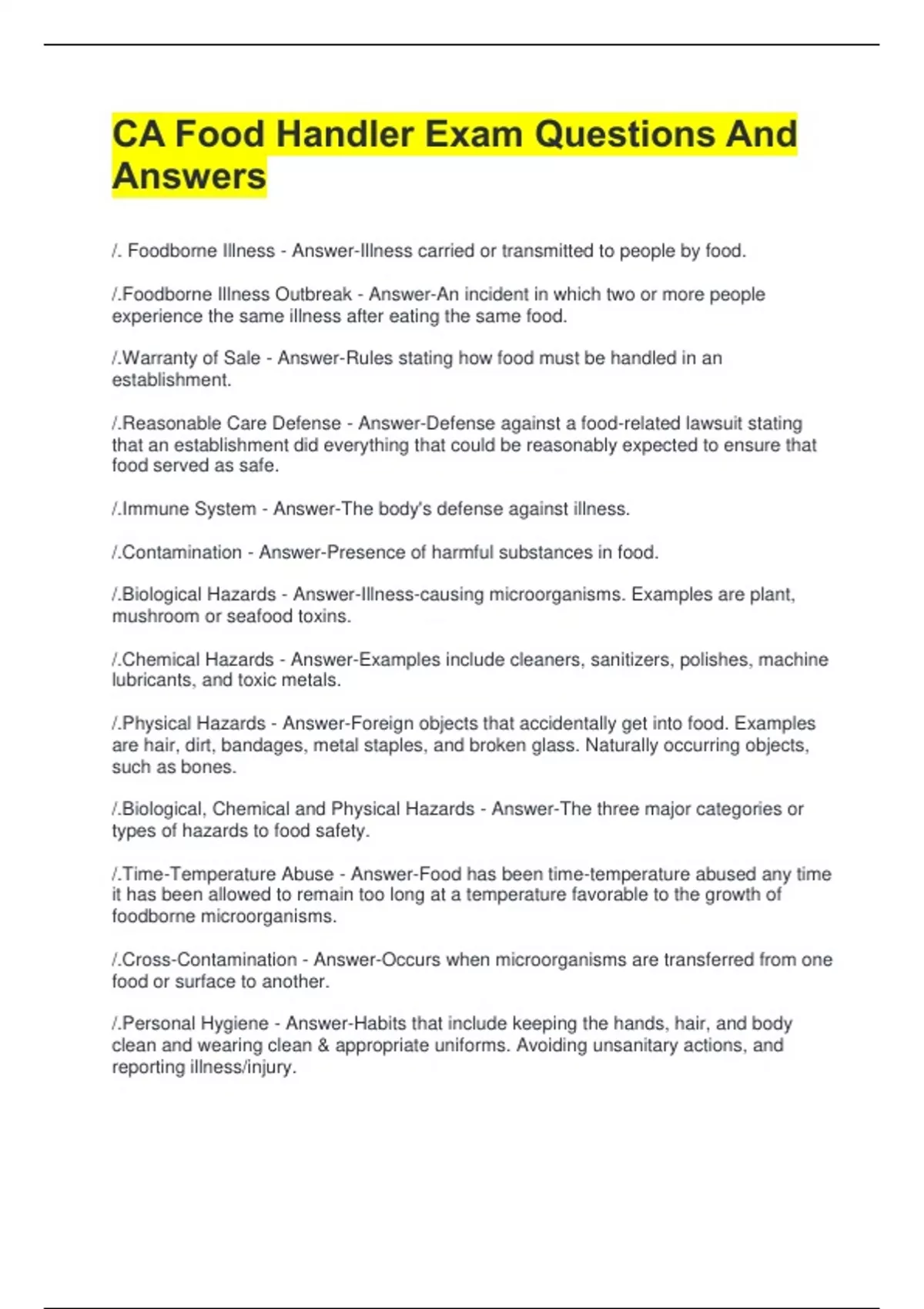 CA Food Handler Exam Questions And Answers /. Foodborne Illness - Answer-Illness carried or transmitted to people by food. /.Foodborne Illness Outbreak - Answer-An incident in which two or more people experience the same illness after eating the same food. /.Warranty of Sale - Answer-Rules stating how food must be handled in an establishment. /.Reasonable Care Defense - Answer-Defense against a food-related lawsuit stating that an establishment did everything that could be reasonably expected to ensure that food served as safe. /.Immune System - Answer-The body's defense against illness. /.Contamination - Answer-Presence of harmful substances in food. /.Biological Hazards - Answer-Illness-causing microorganisms. Examples are plant, mushroom or seafood toxins. /.Chemical Hazards - Answer-Examples include cleaners, sanitizers, polishes, machine lubricants, and toxic metals. /.Physical Hazards - Answer-Foreign objects that accidentally get into food. Examples are hair, dirt, bandages, metal staples, and broken glass. Naturally occurring objects, such as bones. /.Biological, Chemical and Physical Hazards - Answer-The three major categories or types of hazards to food safety. /.Time-Temperature Abuse - Answer-Food has been time-temperature abused any time it has been allowed to remain too long at a temperature favorable to the growth of foodborne microorganisms. /.Cross-Contamination - Answer-Occurs when microorganisms are transferred from one food or surface to another. /.Personal Hygiene - Answer-Habits that include keeping the hands, hair, and body clean and wearing clean & appropriate uniforms. Avoiding unsanitary actions, and reporting illness/injury. /.True or False. A Foodborne-illness outbreak has occured when two or more people get the same illness after eating the same food. - Answer-True. /.True or False. People on chemo have a higher risk of contracting a foodborne illness. - Answer-True. /.Ture or False. Adults are more likely than pre-school age children to become ill from contaminated food. - Answer-False. /.True or False. A foodborne-illness outbreak can raise an establishment's insurance premium. - Answer-True. /.True or False. A foodborne-illness can occur if food is not cooled properly. - Answer-True. /.What are the potential costs associated with foodborne illness outbreaks? - Answer-Loss of customers, Negative media, Lawsuits & legal fees, Increased insurance, Loss of reputation, Lowered employee morale, Employee absenteeism, Staff retraining. /.What are the most common risk factors that cause foodborne illness? - Answer-Purchasing from unsafe sources, Failing to cook food adequately, Holding food at incorrect temperatures, Using contaminated equipment, Poor personal hygiene. /.What are the keys to food safety? - Answer-Controlling time & temp, Practicing good hygiene, Preventing cross-contamination, Purchasing from approved suppliers, Cleaning & sanitizing properly. /.Why are elderly people at a higher risk for fodborne illness? - Answer-Their immune systems are weekened with age. /.What are the three categories of food safety hazards? - Answer-Biological, Chemical and Physical Hazards. /.For a foodborne illness to be considered an "outbreak", a minimum of how many people must experience the same illness after eating the same food? - Answer-Two /.Acording to the CDC, the most common risk factors that cause foodborne illnesses are: - Answer-1) failing to cook food adequately, 2) holding food at incorrect temperatures, 3) using contaminated equipment, 4) practicing poor personal hygiene and 5)purchasing food from unsafe sources. /.Microorganisims - Answer-small, living organisms that can be seen only through a