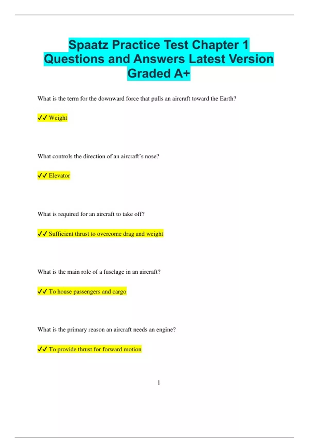 Spaatz Practice Test Chapter 1 Questions and Answers Latest Version Graded A+ What is the term for the downward force that pulls an aircraft toward the Earth? Weight What controls the direction of an aircraft’s nose? Elevator What is required for an aircraft to take off? Sufficient thrust to overcome drag and weight What is the main role of a fuselage in an aircraft? To house passengers and cargo What is the primary reason an aircraft needs an engine? To provide thrust for forward motion 2 What is the purpose of the rudder on an aircraft? To control yaw What forces act on an aircraft during flight? Lift, weight, thrust, and drag What is drag? A resistance force that opposes an aircraft’s motion through the air What is the primary goal of aviation safety? To prevent accidents and protect people What part of an aircraft is responsible for stabilizing flight along its longitudinal axis? Ailerons What is the effect of decreasing altitude on air pressure? Air pressure increases as altitude decreases 3 What is the main function of a propeller on an aircraft? To convert engine power into thrust What must happen for an aircraft to climb? Lift must exceed weight, and thrust must overcome drag What is the purpose of a cockpit in an aircraft? To house the controls and instruments for the pilot What happens when the angle of attack on an aircraft becomes too large? The aircraft stalls What is the term for the measure of how much force an aircraft’s wing produces in relation to its size? Wing loading What helps an aircraft to fly in a stable manner? Proper balance and center of gravity 4 What does the term "stall" refer to in aviation? A condition where the wing can no longer generate sufficient lift due to excessive angle of attack What is the function of ailerons on an aircraft? To control roll What is the term for the amount of thrust an engine provides to an aircraft? Thrust output What is the purpose of the horizontal stabilizer