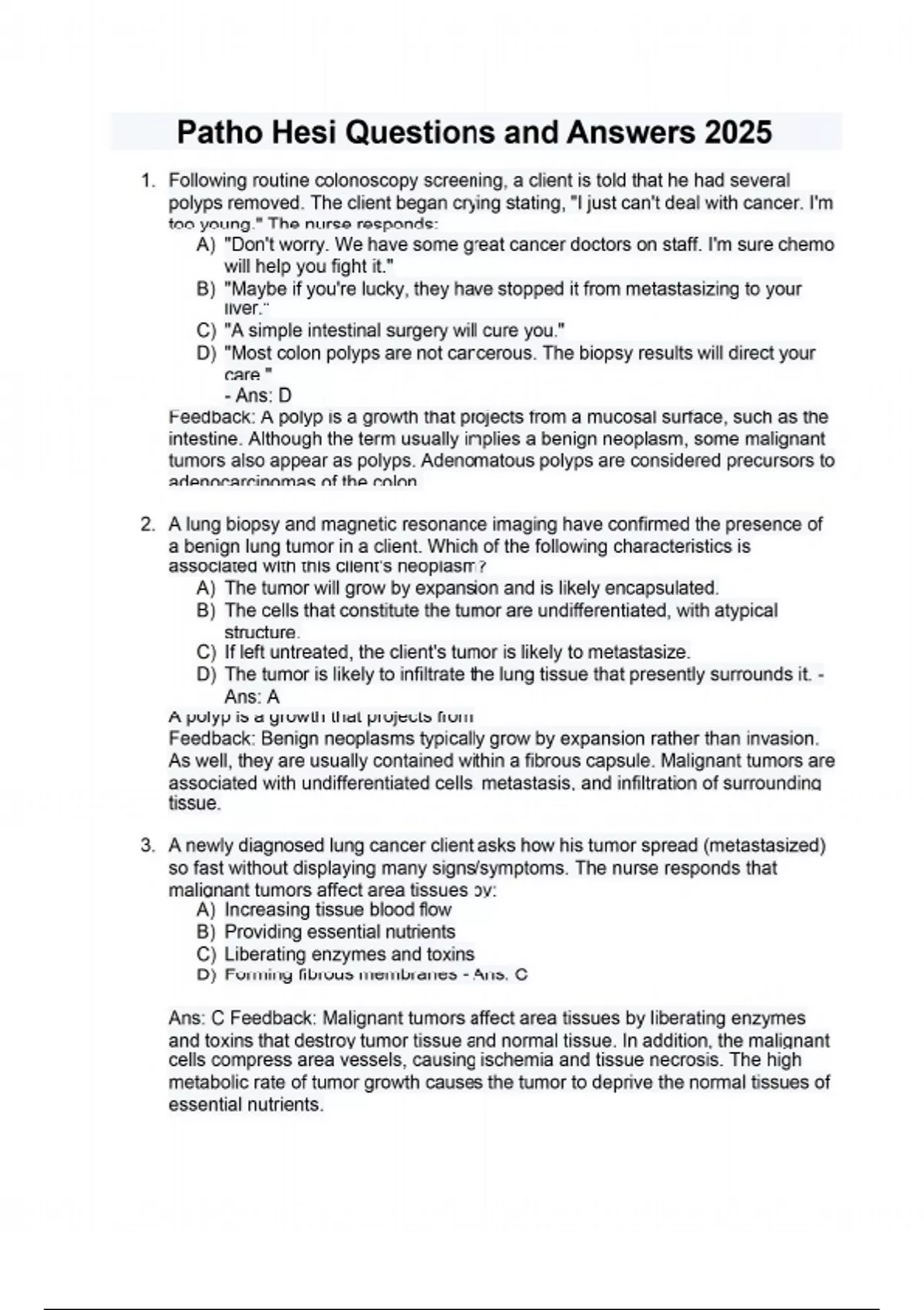 1. Following routine colonoscopy screening, a client is told that he had several polyps removed. The client began crying stating, "I just can't deal with cancer. I'm too young." The nurse responds: A) "Don't worry. We have some great cancer doctors on staff. I'm sure chemo will help you fight it." B) "Maybe if you're lucky, they have stopped it from metastasizing to your liver." C) "A simple intestinal surgery will cure you." D) "Most colon polyps are not cancerous. The biopsy results will direct your care." - Ans: D Feedback: A polyp is a growth that projects from a mucosal surface, such as the intestine. Although the term usually implies a benign neoplasm, some malignant tumors also appear as polyps. Adenomatous polyps are considered precursors to adenocarcinomas of the colon. 2. A lung biopsy and magnetic resonance imaging have confirmed the presence of a benign lung tumor in a client. Which of the following characteristics is associated with this client's neoplasm? A) The tumor will grow by expansion and is likely encapsulated. B) The cells that constitute the tumor are undifferentiated, with atypical structure. C) If left untreated, the client's tumor is likely to metastasize. D) The tumor is likely to infiltrate the lung tissue that presently surrounds it. - Ans: A A polyp is a growth that projects from Feedback: Benign neoplasms typically grow by expansion rather than invasion. As well, they are usually contained within a fibrous capsule. Malignant tumors are associated with undifferentiated cells, metastasis, and infiltration of surrounding tissue. 3. A newly diagnosed lung cancer client asks how his tumor spread (metastasized) so fast without displaying many signs/symptoms. The nurse responds that malignant tumors affect area tissues by: A) Increasing tissue blood flow B) Providing essential nutrients C) Liberating enzymes and toxins D) Forming fibrous membranes - Ans: C Ans: C Feedback: Malignant tumors affect area tissues by liberating enzymes and toxins that destroy tumor tissue and normal tissue. In addition, the malignant cells compress area vessels, causing ischemia and tissue necrosis. The high metabolic rate of tumor growth causes the tumor to deprive the normal tissues of essential nutrients. Feedback: Malignant tumors affect area tissues by liberating enzymes and toxins that destroy tumor tissue and normal tissue. In addition, the malignant cells compress area vessels, causing ischemia and tissue necrosis. The high metabolic rate of tumor growth causes the tumor to deprive the normal tissues of essential nutrients. 4. A client had a positive Pap smear. The surgeon diagnosed "cancer in situ of the cervix." The client asks, "What does this mean?" From the following statements, which is most appropriate in response to this question? The tumor has: A) Been walled off within a strong fibrous capsule B) Developed a distant infiltration C) Not crossed the basement membrane, so it can be surgically removed with little chance of growing back D) Grown undifferentiated cells that no longer look like the tissue from which it arose - Ans: C Feedback: Cancer in situ is a localized preinvasive lesion. As an example, in breast ductal carcinoma, in situ the cells have not crossed the basement membrane. Depending on its location, an in situ lesion usually can be removed surgically or treated so that the chances of recurrence are small. For example, cancer in situ of the cervix is essentially 100% curable 5. While studying to become chemo-certified, the nurse reviews some basic concepts about cancer cells. When a client asks about why the tumor grows so fast, the nurse will respond based on which of the following physiological principles? Select all that apply. A) Cancer cells have shorter cell cycle times than normal cells. B) Cancer cells do not die when they are programmed to die. C) Growth factors prevents cancer cells from entering resting (G0) cell cycle phase. D) Cancer cells will reach a balance between cell birth and cell death rate. E) Cancer cells never reach a flattened growth rate. - Ans: B, C Feedback: One of the reasons cancerous tumors often seem to grow so rapidly relates to the size of the cell pool that is actively engaged in cycling. It has been shown that the cell cycle time of cancerous tissue cells is not necessarily shorter than that of normal cells. Rather, cancer cells do not die on schedule, and growth factors prevent cells from exiting the cell cycle and entering the G0 or noncycling phase. The ratio of dividing cells to resting cells in a tissue mass is called the growth fraction. The doubling time is the length of time it takes for the total mass of cells in a tumor to double. As the growth fraction increases, the doubling time decreases. When normal tissues reach their adult size, an equilibrium between cell birth and cell death is reached. Cancer cells, however, continue to divide until limitations in blood supply and nutrients inhibit their growth. When this occurs, the doubling time for cancer cells decreases. The initial growth rate is exponential and then tends to decrease or flatten out over time. 6. Although growth rate is variable among types of bacteria, the growth of bacteria is dependent on: A) Biofilm communication B) Availability of nutrients C) An intact protein capsid D) Individual cell motility - Ans: B Feedback: Bacterial growth is dependent upon the availability of nutrients and physical growth conditions. Bacteria prefer to colonize as biofilm and communicate with other bacteria within the biofilm, but biofilm is not necessary for growth. Viruses (not bacteria) form a capsid. Although some bacteria have projections for motility, these are not necessary for growth. 7. Which of the following outpatients are at a greater risk for developing Treponema pallidum, the cause of syphilis? Select all that apply. A) A homeless adolescent female performing oral sex for money B) A male who frequents clubs catering to exotic dancers and sexual favors C