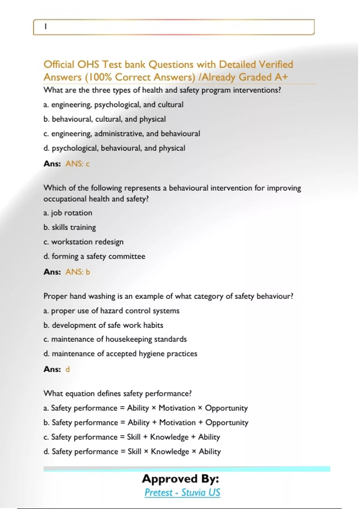 Official OHS Test bank Questions with Detailed Verified Answers (100% Correct Answers) /Already Graded A+Official OHS Test bank Questions with Detailed Verified Answers (100% Correct Answers) /Already Graded A+Official OHS Test bank Questions with Detailed Verified Answers (100% Correct Answers) /Already Graded A+