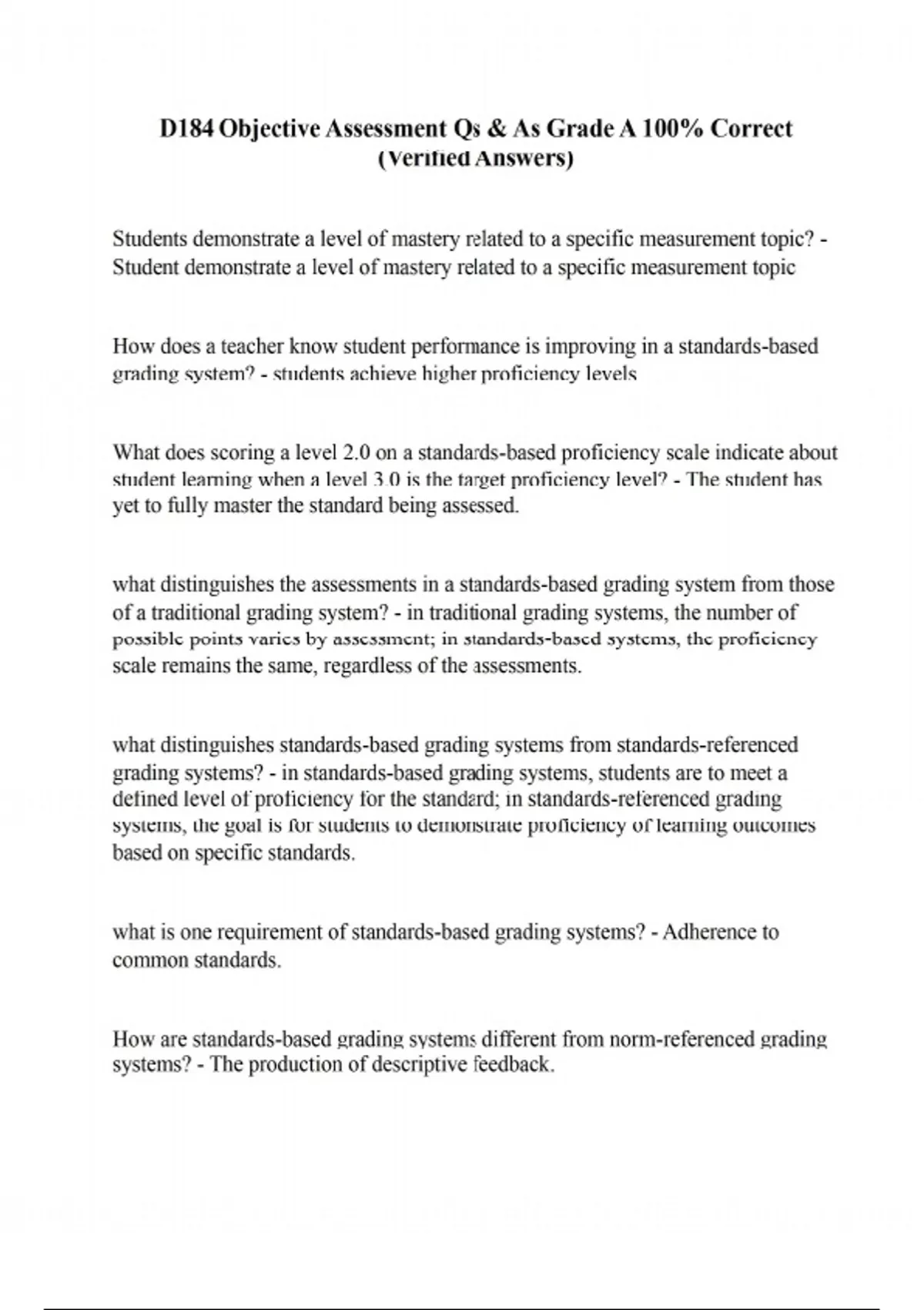which grading system focuses on converting demonstrated levels of mastery to total points earned on a proficiency scale? - Standards-based grading system what is a teacher's primary focus in a standards-based grading system? - measuring student learning related to the achievement of learning goals which advantage do standards-based grading systems have over traditional grading systems? - one individual standard is assessed at a time, rather than multiple standards. what is one advantage of using a numerical score of 2.0 rather than a letter grade of C or D to communicate a student's proficiency level to guardians? - assigning a student a numerical proficiency level of 2.0 more clearly indicates the student's need for additional practice to achieve proficiency. what is a common criticism of standards-based grading? - assessment results do not contain outside of the stated standards. what is the purpose of a focus statement for a standard? - to clarify the standard for classroom assessment how do measurement topics guide the assessment development process? - they help identify content and skills to be tested. which element is included in measurement topics? - concepts which focus statement assesses declarative knowledge? - understands the synthesis of adenosine triphosphate