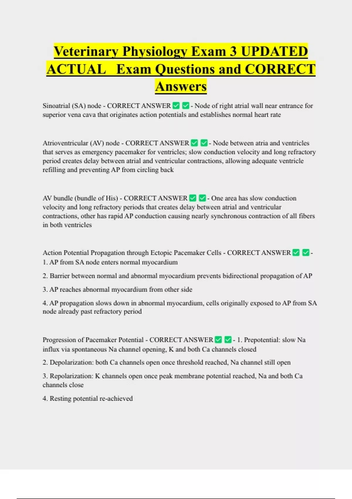 Veterinary Physiology Exam 3 UPDATED ACTUAL Exam Questions and CORRECT Answers Sinoatrial (SA) node - CORRECT ANSWER - Node of right atrial wall near entrance for superior vena cava that originates action potentials and establishes normal heart rate Atrioventricular (AV) node - CORRECT ANSWER - Node between atria and ventricles that serves as emergency pacemaker for ventricles; slow conduction velocity and long refractory period creates delay between atrial and ventricular contractions, allowing adequate ventricle refilling and preventing AP from circling back
