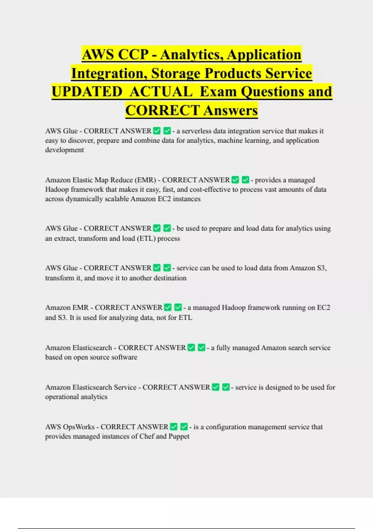AWS CCP - Analytics, Application Integration, Storage Products Service UPDATED ACTUAL Exam Questions and CORRECT Answers AWS Glue - CORRECT ANSWER - a serverless data integration service that makes it easy to discover, prepare and combine data for analytics, machine learning, and application development Amazon Elastic Map Reduce (EMR) - CORRECT ANSWER - provides a managed Hadoop framework that makes it easy, fast, and cost-effective to process vast amounts of data across dynamically scalable Amazon EC2 instances