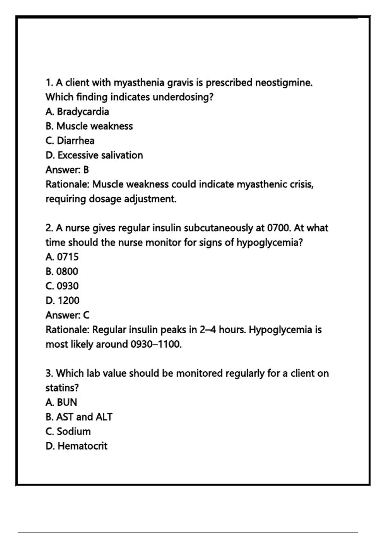 1. A client with myasthenia gravis is prescribed neostigmine.