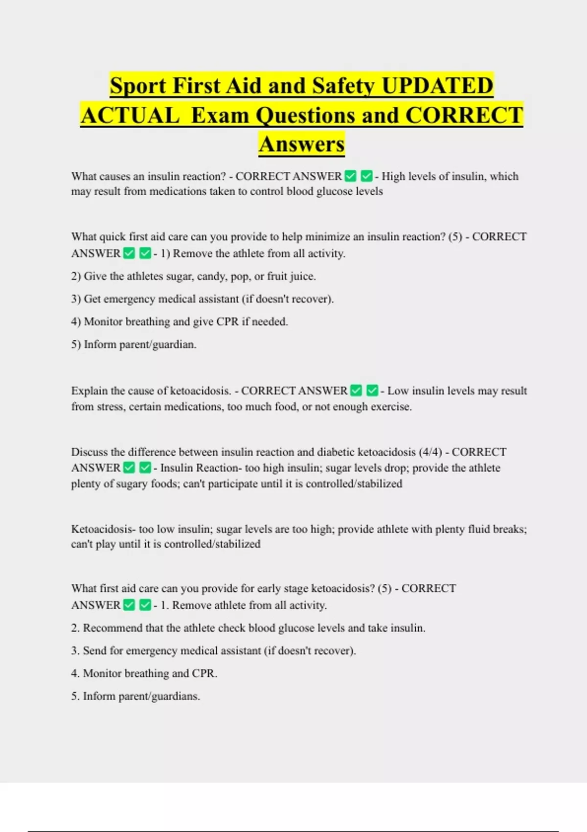 Sport First Aid and Safety UPDATED ACTUAL Exam Questions and CORRECT Answers What causes an insulin reaction? - CORRECT ANSWER - High levels of insulin, which may result from medications taken to control blood glucose levels What quick first aid care can you provide to help minimize an insulin reaction? (5) - CORRECT ANSWER - 1) Remove the athlete from all activity. 2) Give the athletes sugar, candy, pop, or fruit juice. 3) Get emergency medical assistant (if doesn't recover). 4) Monitor breathing and give CPR if needed. 5) Inform parent/guardian.