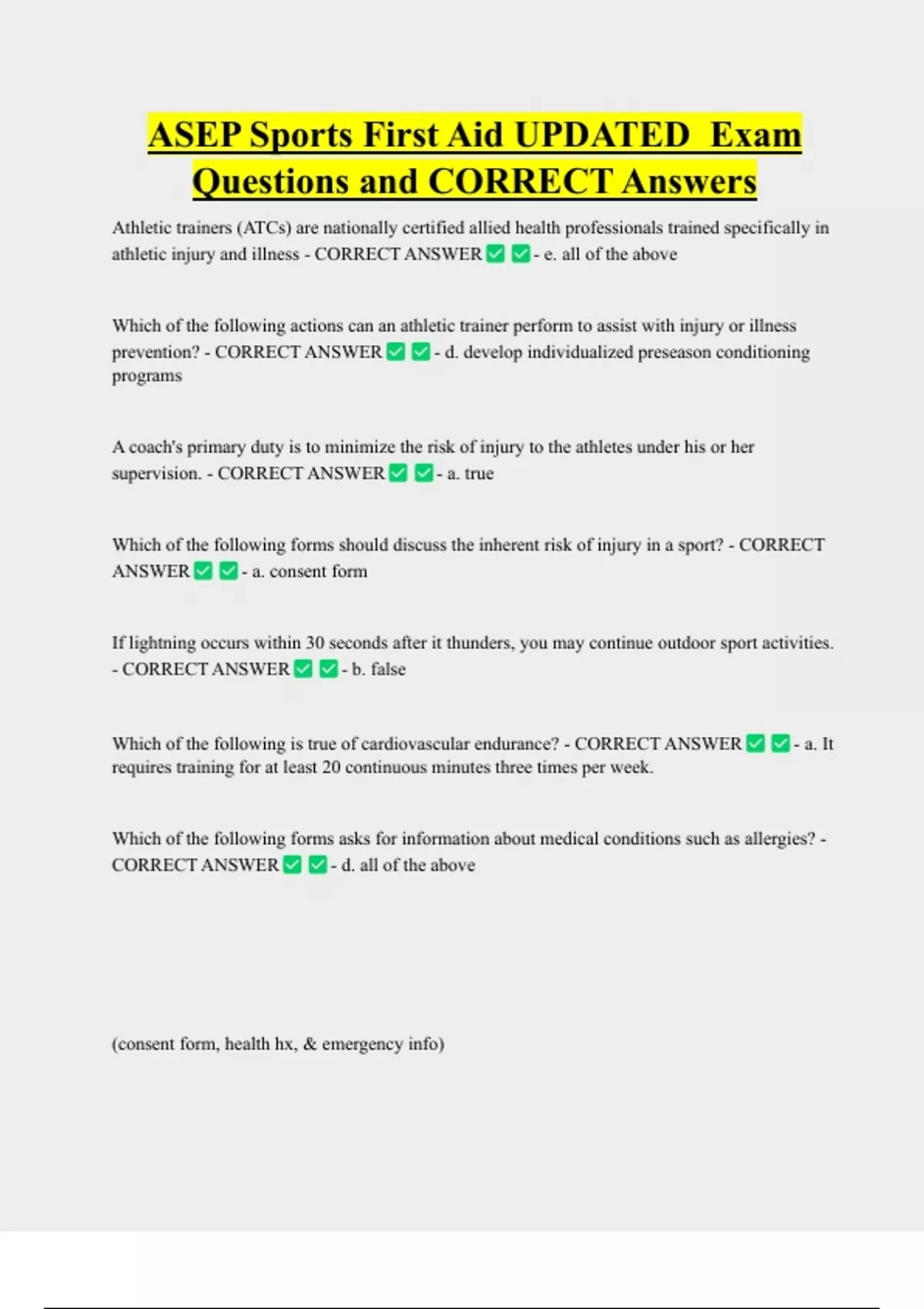 ASEP Sports First Aid UPDATED Exam Questions and CORRECT Answers Athletic trainers (ATCs) are nationally certified allied health professionals trained specifically in athletic injury and illness - CORRECT ANSWER - e. all of the above Which of the following actions can an athletic trainer perform to assist with injury or illness prevention? - CORRECT ANSWER - d. develop individualized preseason conditioning programs A coach's primary duty is to minimize the risk of injury to the athletes under his or her supervision. - CORRECT ANSWER - a. true