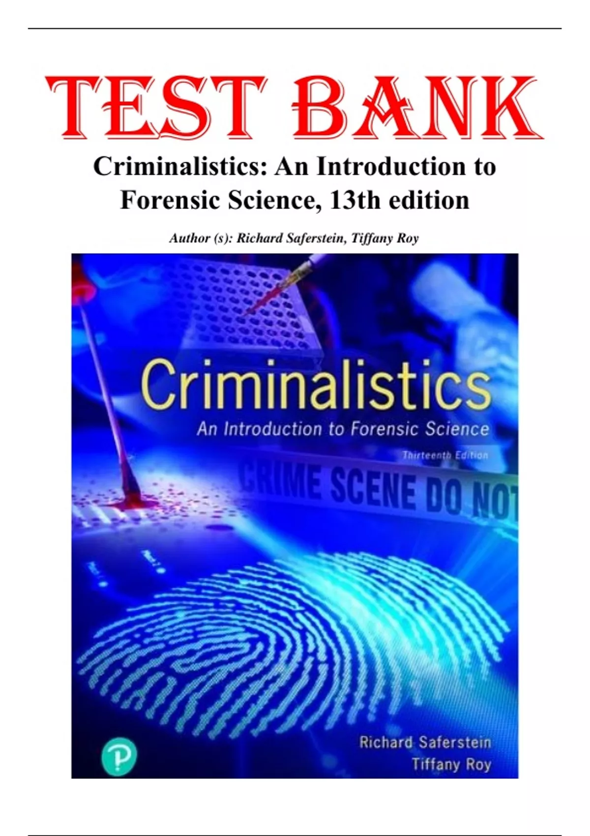 Test Bank for Criminalistics: An Introduction to Forensic Science, 13th Edition Saferstein, Chapters 1-20. Full Chapters Include;....1.Introduction. 2.The Crime Scene. 3.Physical Evidence. 4.Crime-Scene Reconstruction: Bloodstain Pattern Analysis. 5.Death Investigation. 6.Fingerprints. 7.Forensic Biometrics. 8.The Microscope. 9.Firearms, Tool Marks, and Other Impressions. 10.Matter, Light, and Glass Examination. 11.Hairs and Fibers. 12.Drugs. 13.Forensic Toxicology. 14.Metals, Paint and Soil. 15.Forensic Serology. 16.DNA: The Indispensable Forensic Science Tool. 17.Forensic Aspects of Fire and Explosion Investigation. 18.Document Examination. 19.Computer Forensics. 20.Mobile Device Forensics.