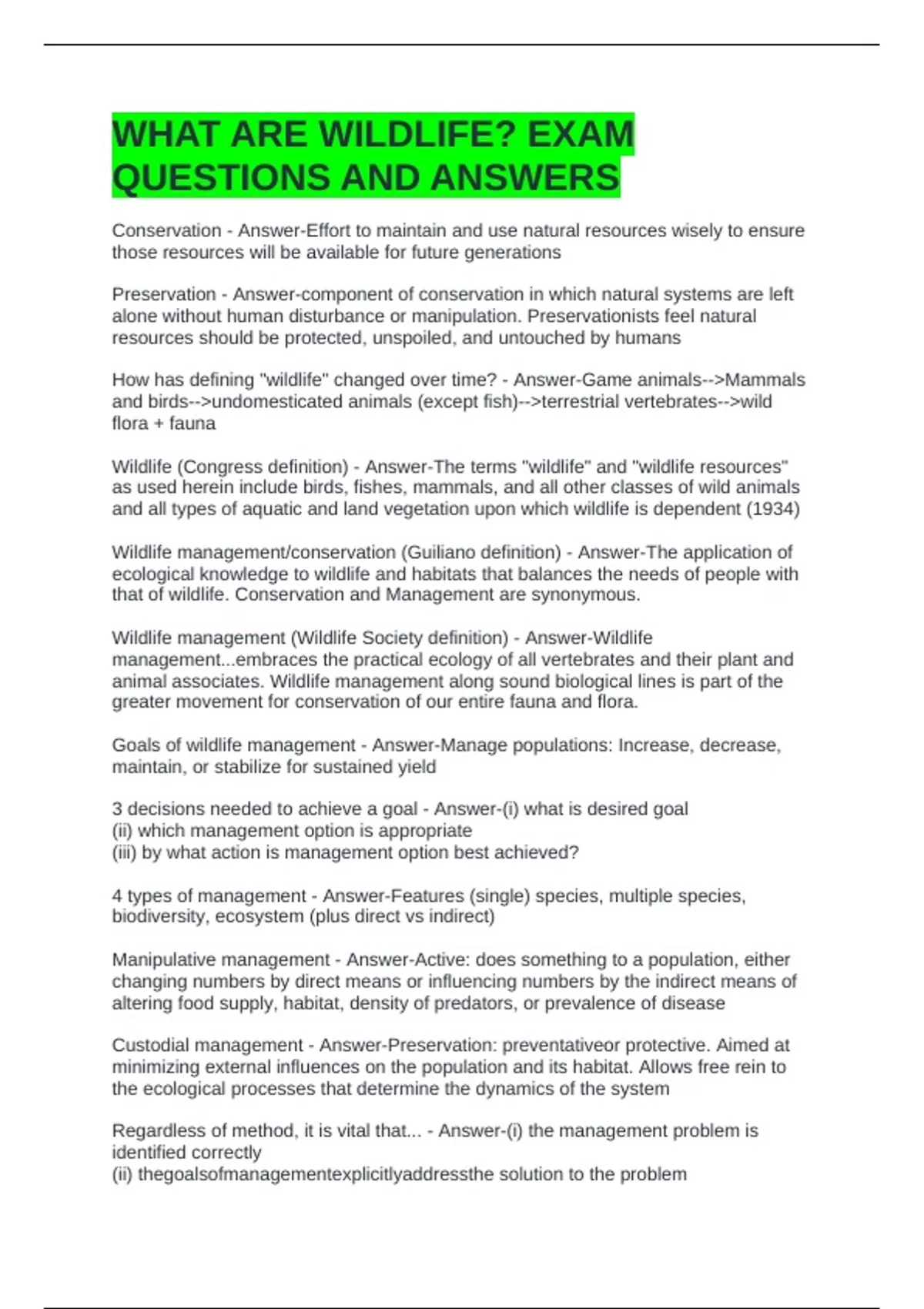 Wildlife management (Wildlife Society definition) - Answer-Wildlife
