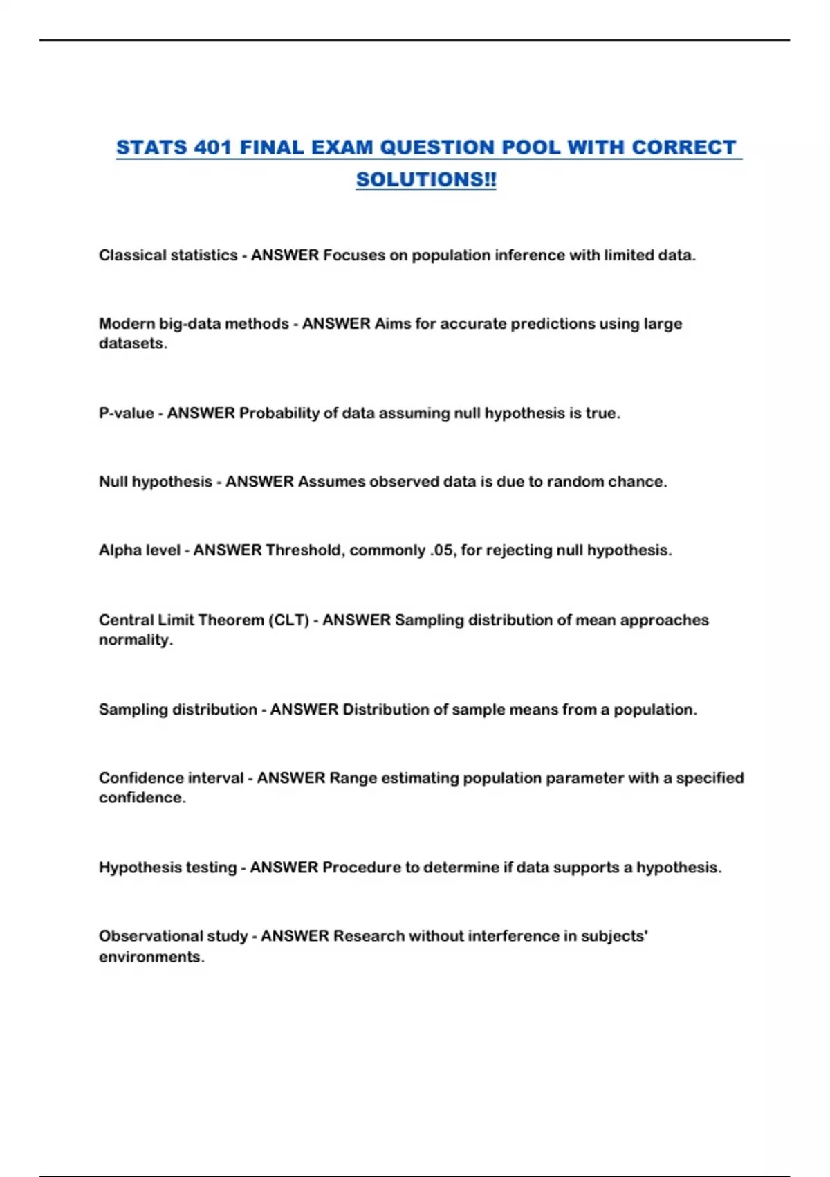 STATS 401 FINAL EXAM QUESTION POOL WITH CORRECT SOLUTIONS!!...