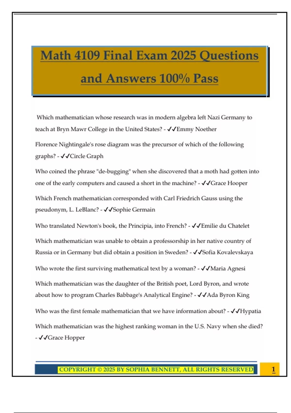 Math 4109 Final Exam 2025 Questions and Answers 100% Pass Which mathematician whose research was in modern algebra left Nazi Germany to teach at Bryn Mawr College in the United States? - Emmy Noether Florence Nightingale's rose diagram was the precursor of which of the following graphs? - Circle Graph Who coined the phrase "de-bugging" when she discovered that a moth had gotten into one of the early computers and caused a short in the machine? - Grace Hooper Which French mathematician corresponded with Carl Friedrich Gauss using the pseudonym, L. LeBlanc? - Sophie Germain Who translated Newton's book, the Principia, into French? - Emilie du Chatelet Which mathematician was unable to obtain a professorship in her native country of Russia or in Germany but did obtain a position in Sweden? - Sofia Kovalevskaya Who wrote the first surviving mathematical text by a woman? - Maria Agnesi Which mathematician was the daughter of the British poet, Lord Byron, and wrote about how to program Charles Babbage's Analytical Engine? - Ada Byron King Who was the first female mathematician that we have information about? - Hypatia Which mathematician was the highest ranking woman in the U.S. Navy when she died? - Grace Hopper 2COPYRIGHT © 2025 BY SOPHIA BENNETT, ALL RIGHTS RESERVED Who wrote The Principia? - Isaac Newton Which mathematician is credited with first using the symbol ∫ for the integral? - Gottfried Wilhelm Leibniz What did Newton call his method of calculus? - Method of fluxions Isaac Newton was the Lucasian Professor of Mathematics at what university in England? - University of Cambridge What is Newton's third law of motion due to gravity? - To every action there is an equal and opposite reaction. How did Newton's Generalized Binomial Theorem improve on the expansion of (a + b)^n - n could be annoy rational number According to Newton, what is a fluxion? - The speed at which a quantity changes Many mathematicians made progress on the proof of the Fundamental Theorem of Algebra. What was Euler's contribution? - He proved the theorem for polynomial equations of degree less than or equal to 6. Working independently of Isaac Newton, what other mathematician developed the basics of calculus at just about the same time? - Gottfried Wilhelm Leibniz Who is known as the Prince of Mathematicians? - Carl Friedrich Gauss Which French mathematician intervened with the French army to guarantee Gauss's safety during the Napoleonic wars? - Sophie Germain