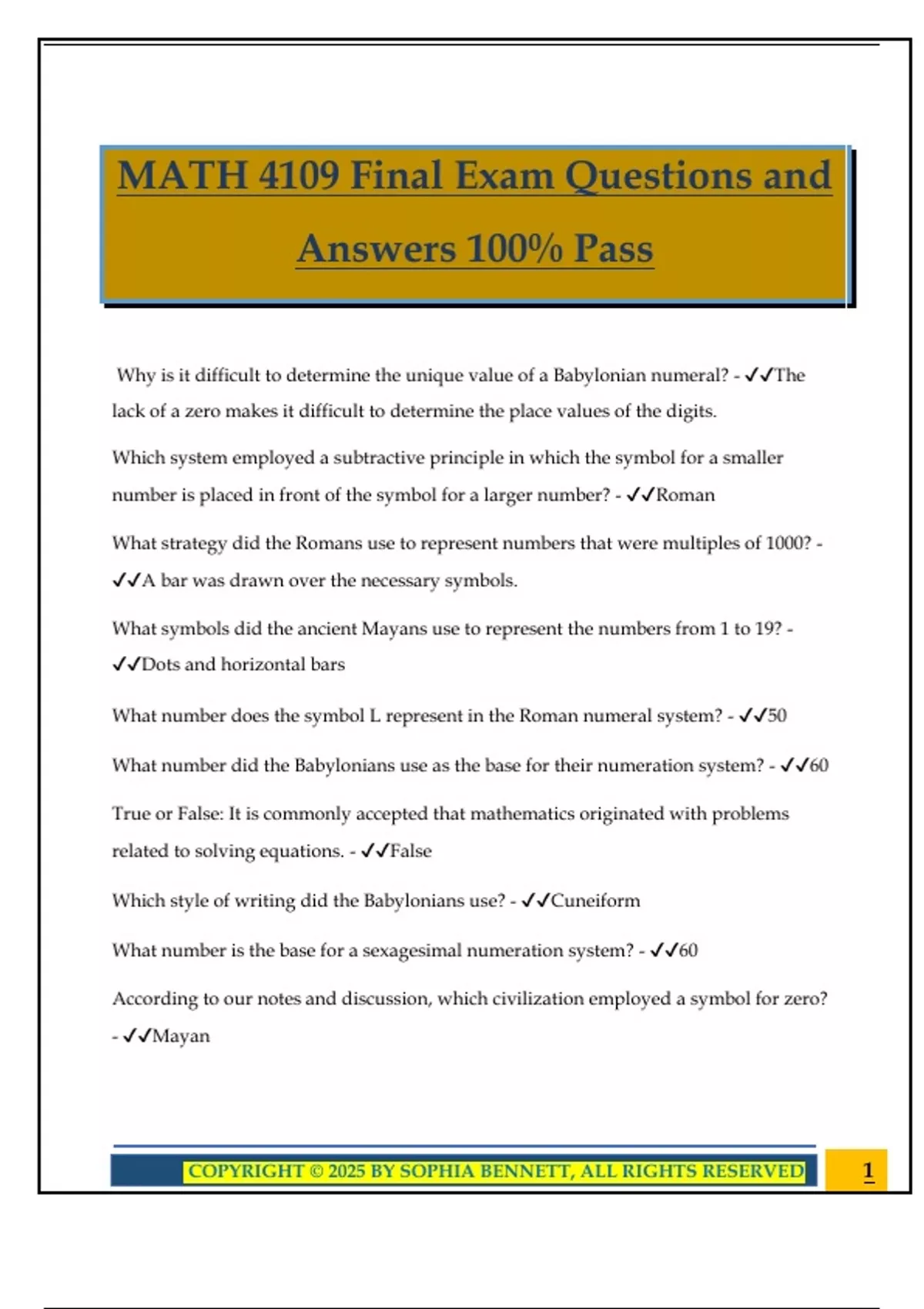MATH 4109 Final Exam Questions and Answers 100% Pass Why is it difficult to determine the unique value of a Babylonian numeral? - The lack of a zero makes it difficult to determine the place values of the digits. Which system employed a subtractive principle in which the symbol for a smaller number is placed in front of the symbol for a larger number? - Roman What strategy did the Romans use to represent numbers that were multiples of 1000? - A bar was drawn over the necessary symbols. What symbols did the ancient Mayans use to represent the numbers from 1 to 19? - Dots and horizontal bars What number does the symbol L represent in the Roman numeral system? - 50 What number did the Babylonians use as the base for their numeration system? - 60 True or False: It is commonly accepted that mathematics originated with problems related to solving equations. - False Which style of writing did the Babylonians use? - Cuneiform What number is the base for a sexagesimal numeration system? - 60 According to our notes and discussion, which civilization employed a symbol for zero? - Mayan 2COPYRIGHT © 2025 BY SOPHIA BENNETT, ALL RIGHTS RESERVED What was the most important rule that the Egyptians used when they wrote sums of unit fractions? - They could never use the same unit fraction twice. Egypt is on which continent? - Africa What was unique about the Egyptians' work with fractions? - Their refusal to deal with fractions that were not unit fractions or (2/3) For the Egyptians, the multiplication of two numbers was accomplished by successively doubling one of the factors. After that was done, what operation was used? - Addition What was the only fraction used by the Egyptians besides unit fractions? - (2/3) Why is it generally accepted that geometry originated in the ancient Egyptian empire? - The yearly floods of the Nile required that land had to be remeasured for tax purposes. Most of our knowledge of early mathematics in Egypt comes from two papyri. One is known as the Moscow Papyrus. What is the other one called? - The Rhind Papyrus The method of false position is most similar to which problem-solving strategy? - Guess and Check (also know as trial and error) Whose army uncovered the Rosetta Stone in 1799? - Napoleon True or False: The Egyptians had a symbol for zero. - False To find the length of a diagonal of a given square, the Babylonians u