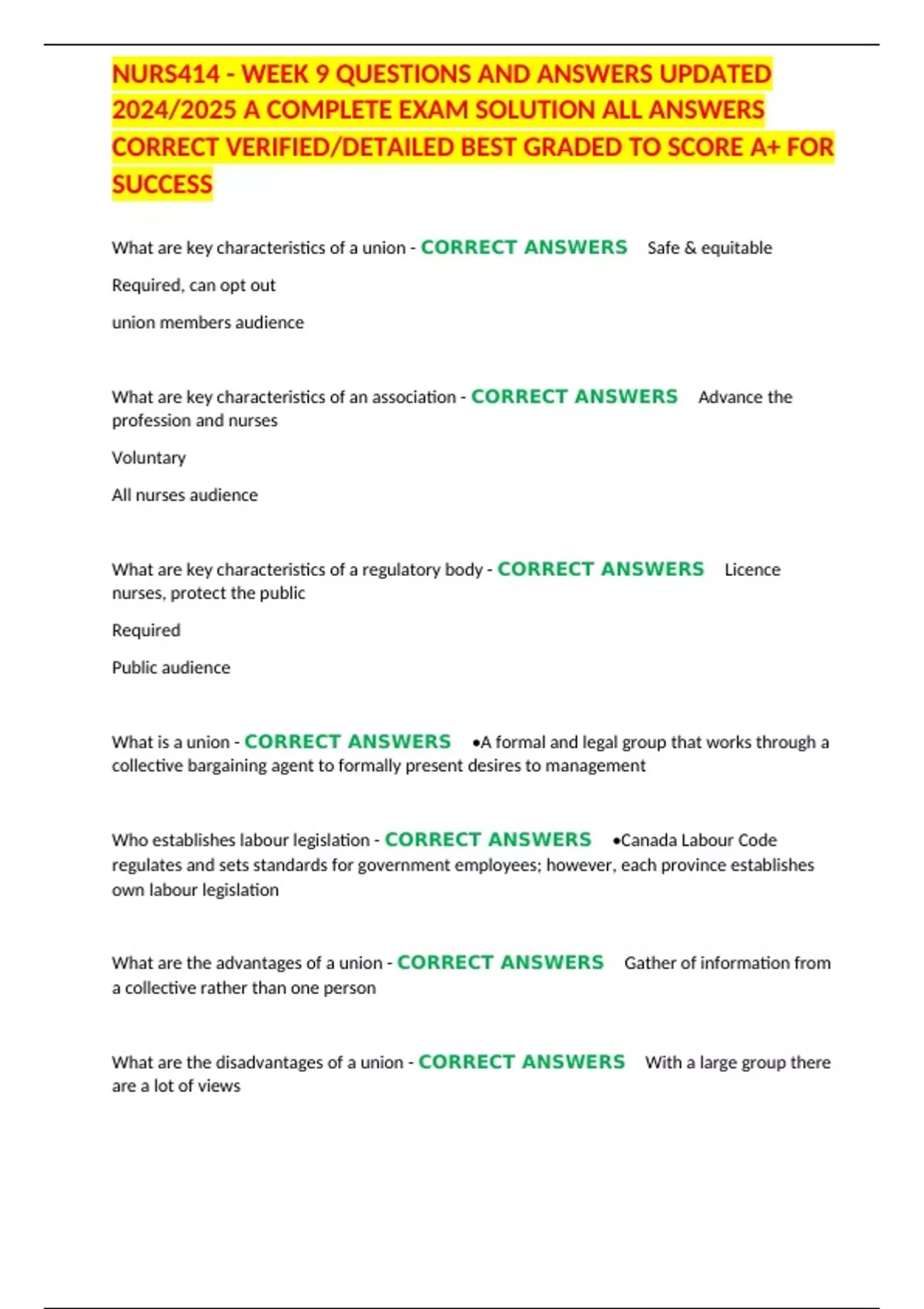 , NURS414 - WEEK 9 QUESTIONS AND ANSWERS UPDATED