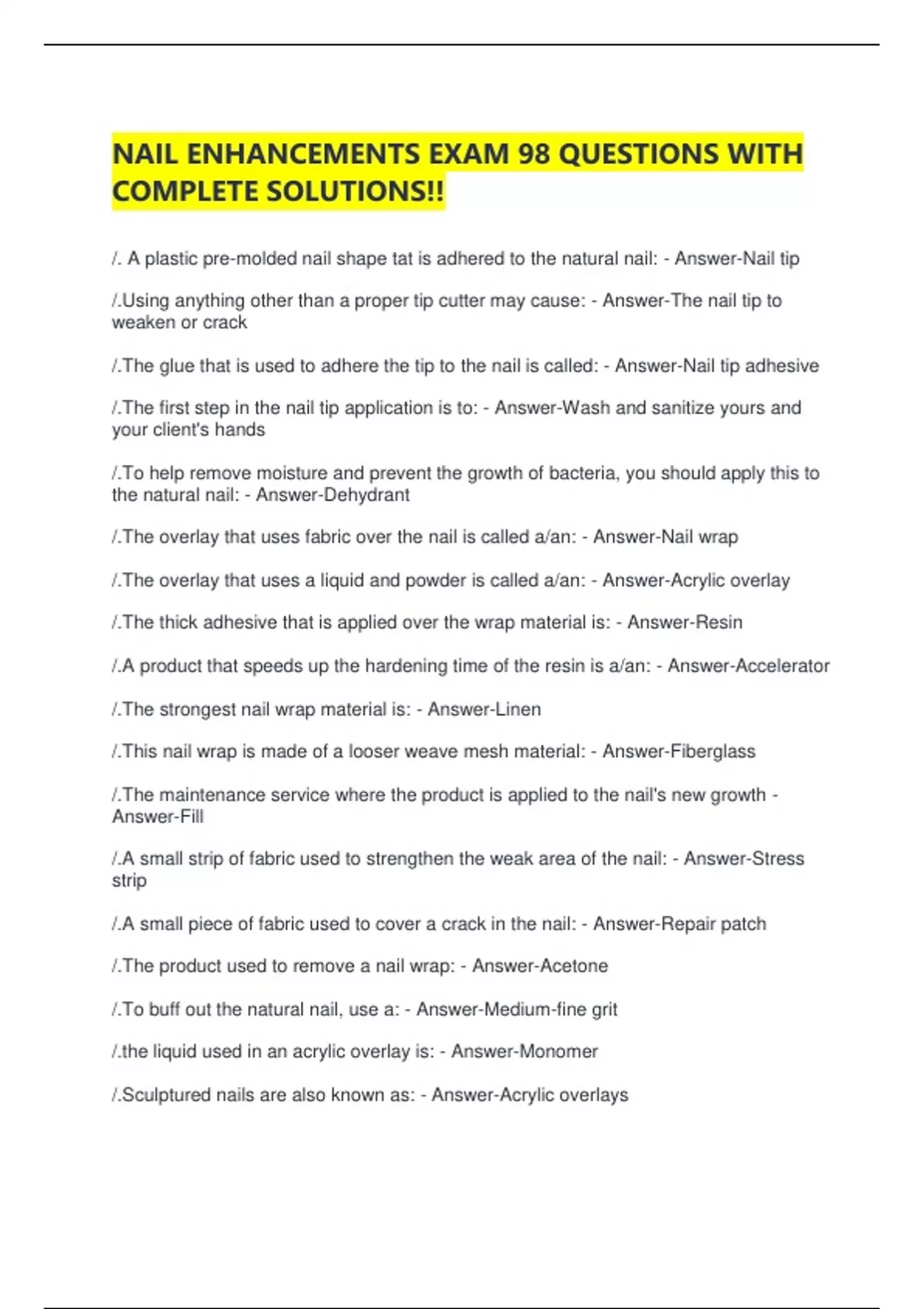 NAIL ENHANCEMENTS EXAM 98 QUESTIONS WITH COMPLETE SOLUTIONS!! /. A plastic pre-molded nail shape tat is adhered to the natural nail: - Answer-Nail tip /.Using anything other than a proper tip cutter may cause: - Answer-The nail tip to weaken or crack /.The glue that is used to adhere the tip to the nail is called: - Answer-Nail tip adhesive /.The first step in the nail tip application is to: - Answer-Wash and sanitize yours and your client's hands /.To help remove moisture and prevent the growth of bacteria, you should apply this to the natural nail: - Answer-Dehydrant /.The overlay that uses fabric over the nail is called a/an: - Answer-Nail wrap /.The overlay that uses a liquid and powder is called a/an: - Answer-Acrylic overlay /.The thick adhesive that is applied over the wrap material is: - Answer-Resin /.A product that speeds up the hardening time of the resin is a/an: - Answer-Accelerator /.The strongest nail wrap material is: - Answer-Linen /.This nail wrap is made of a looser weave mesh material: - Answer-Fiberglass /.The maintenance service where the product is applied to the nail's new growth - Answer-Fill /.A small strip of fabric used to strengthen the weak area of the nail: - Answer-Stress strip /.A small piece of fabric used to cover a crack in the nail: - Answer-Repair patch /.The product used to remove a nail wrap: - Answer-Acetone /.To buff out the natural nail, use a: - Answer-Medium-fine grit /.the liquid used in an acrylic overlay is: - Answer-Monomer /.Sculptured nails are also known as: - Answer-Acrylic overlays