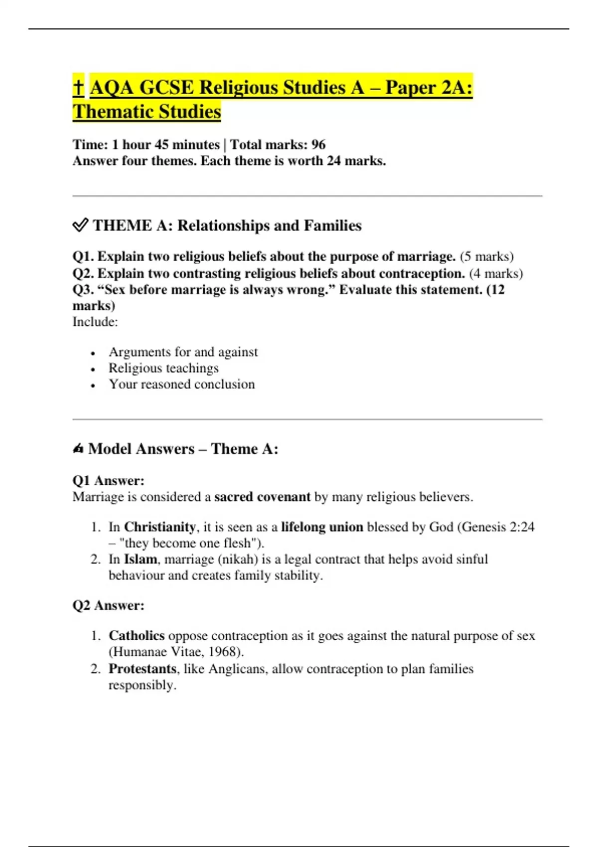 Q1. Explain two religious beliefs about the purpose of marriage. (5 marks)