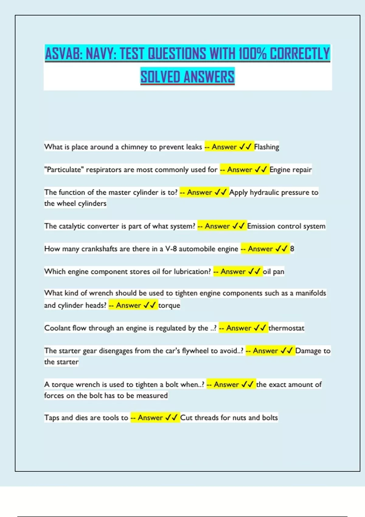ASVAB: NAVY: TEST QUESTIONS WITH 100% CORRECTLY