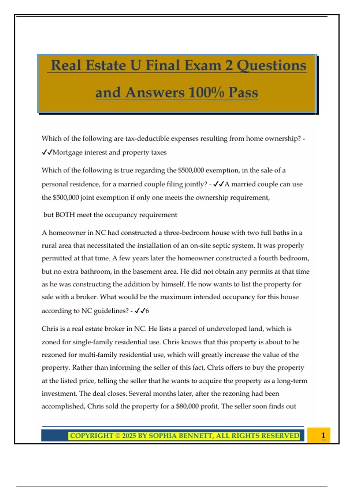 Real Estate U Final Exam 2 Questions and Answers 100% Pass Which of the following are tax-deductible expenses resulting from home ownership? - Mortgage interest and property taxes Which of the following is true regarding the $500,000 exemption, in the sale of a personal residence, for a married couple filing jointly? - A married couple can use the $500,000 joint exemption if only one meets the ownership requirement, but BOTH meet the occupancy requirement A homeowner in NC had constructed a three-bedroom house with two full baths in a rural area that necessitated the installation of an on-site septic system. It was properly permitted at that time. A few years later the homeowner constructed a fourth bedroom, but no extra bathroom, in the basement area. He did not obtain any permits at that time as he was constructing the addition by himself. He now wants to list the property for sale with a broker. What would be the maximum intended occupancy for this house according to NC guidelines? - 6 Chris is a real estate broker in NC. He lists a parcel of undeveloped land, which is zoned for single-family residential use. Chris knows that this property is about to be rezoned for multi-family residential use, which will greatly increase the value of the property. Rather than informing the seller of this fact, Chris offers to buy the property at the listed price, telling the seller that he wants to acquire the property as a long-term investment. The deal closes. Several months later, after the rezoning had been accomplished, Chris sold the property for a $80,000 profit. The seller soon finds out 2COPYRIGHT © 2025 BY SOPHIA BENNETT, ALL RIGHTS RESERVED about the profit Chris has made. What can the seller do in this case? - Notify the NCREC to impose disciplinary action Which of the following is an example of a blind ad? - Just listed! Home for sale. $250,000. Call Mary at for more information. A settlement meeting is usually conducted by a closing attorney. Who typically recommends the closing attorney? - The buyer or the buyer's lender A firm license is NOT required for which of the following? - a sole proprietorship James is a broker in NC and is also licensed as an attorney. He is buying a house and wants to rewrite part of the sales contract. Is James permitted to do so? - Yes. Since James is also an attorney and the buyer, he is permitted to rewrite parts of the contract. Samantha is a newly licensed provisional broker in NC who passed the licensing exam on July 12, 2021. In order to have her license remain on "Active" status, when must she complete 8 hours of continuing education? - By June 10 of 2023 Sam is a non-provisional broker whose license is on "Active" status though he is not affiliated with a Broker in Charge (including himself). He is ONLY paid referral fees as he refers all real estate activities to other brokers. He maintains a public website where people can ask for information about the value of their home and Sam refers all of these questions to other "Active" brokers. Is Sam's website within the rules of the NCREC? - No Mark is a licensed broker in NC who owns several investment properties, which he rents out. He also provides property managem