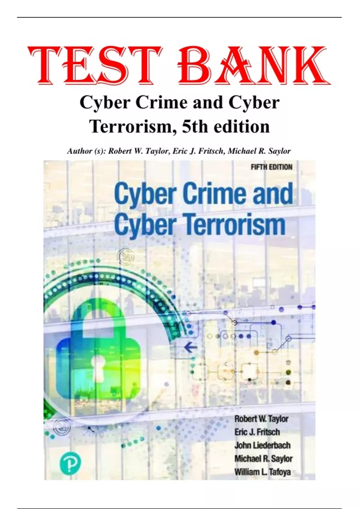 Test Bank for Cyber Crime and Cyber Terrorism 5th Edition By Robert Taylor, Chapters 1-15. Full Chapters Covered;.....I: THE ETIOLOGY OF CYBER CRIME AND CYBER TERRORISM 1. Introduction and Overview of Cyber Crime and Cyber Terrorism 2. Cyber Terrorism and Information Warfare 3. The Criminology of Computer Crime 4. Hackers 5. Sophisticated Cyber Criminal Organizations II: CYBER CRIME: TYPES, NATURE, AND EXTENT 6. White-Collar Crimes 7. Viruses and Malicious Code 8. Sex Crimes, Victimization, and Obscenity on the World Wide Web 9. Anarchy and Hate of the World Wide Web III: CONTROLLING CYBER CRIME: LEGISLATION, LAW ENFORCEMENT, AND INVESTIGATION 10. Digital Laws and Legislation 11. Law Enforcement Roles and Responses 12. The Investigation of Computer-Related Crime 13. Digital Forensics IV: THE FUTURE OF CYBER CRIME AND CYBER TERRORISM: PREVENTION AND TRENDS 14. Information Security and Infrastructure Protection 15. Cyber Crime and Terrorism: A Forecast of Trends and Policy Implications