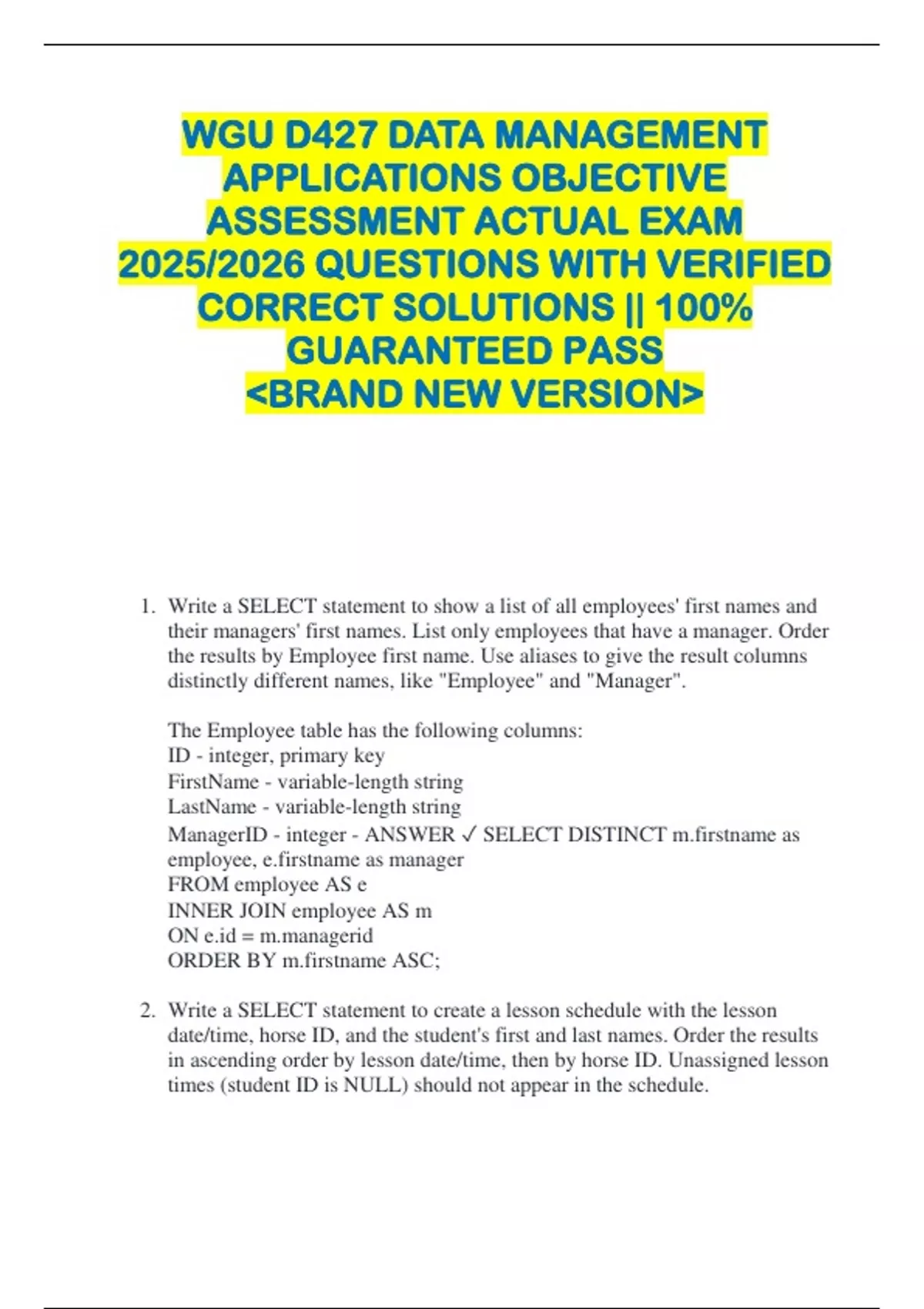 WGU D427 DATA MANAGEMENT APPLICATIONS OBJECTIVE ASSESSMENT ACTUAL EXAM 2025/2026 QUESTIONS WITH VERIFIED CORRECT SOLUTIONS || 100% GUARANTEED PASS BRAND NEW VERSION 1. Write a SELECT statement to show a list of all employees' first names and their managers' first names. List only employees that have a manager. Order the results by Employee first name. Use aliases to give the result columns distinctly different names, like "Employee" and "Manager". The Employee table has the following columns: ID - integer, primary key FirstName - variable-length string LastName - variable-length string ManagerID - integer - ANSWER SELECT DISTINCT name as employee, name as manager FROM employee AS e INNER JOIN employee AS m ON = erid ORDER BY name ASC; 2. Write a SELECT statement to create a lesson schedule with the lesson date/time, horse ID, and the student's first and last names. Order the results in ascending order by lesson date/time, then by horse ID. Unassigned lesson times (student ID is NULL) should not appear in the schedule. Horse with columns: ID - primary key RegisteredName Breed Height BirthDate Student with columns: ID - primary key FirstName LastName Street City State Zip Phone EmailAddress LessonSchedule with columns: HorseID - partial primary key, foreign key references Horse(ID) StudentID - foreign key references Student(ID) LessonDateTime - partial primary key - ANSWER SELECT LessonDateTime, HorseID, FirstName, LastName FROM lessonschedule INNER JOIN student ON studentid = id ORDER BY lessondatetime, horseid ASC; 3. Write a SELECT statement to create a lesson schedule for Feb 1, 2020 with the lesson date/time, student's first and last names, and the horse's registered name. Order the results in ascending order by lesson date/time, then by the horse's registered name. Make sure unassigned lesson times (student ID is NULL) appear in the results. Horse with columns: ID - primary key RegisteredName Breed Height BirthDate Student with columns: ID - primary key FirstName LastName Street City State Zip Phone EmailAddress LessonSchedule with columns: HorseID - partial primary key, foreign key references Horse(ID) StudentID - foreign key references Student(ID) LessonDateTime - partial primary key - ANSWER SELECT ndatetime, name, ame, teredname FROM lessonschedule LEFT JOIN student ON ntid = LEFT JOIN horse ON id = WHERE date(ndatetime) = '' ORDER BY ndatetime ASC, teredname ASC; 2.14 LAB - Select tall horses with subquery The Horse table has the following columns: ID - integer, primary key RegisteredName - variable-length string Breed - variable-length string Height - decimal number BirthDate - date 4. Write a SELECT statement to select the registered name and height for only horses that have an above average height. Order the results by height (ascending). - ANSWER SELECT registeredname, height FROM horse WHERE height ( SELECT AVG(height) FROM horse) ORDER BY height ASC; 5. Which SQL statement is used to remove rows of data from a database? - ANSWER DELETE 6. What is the purpose of the ON clause in SQL joins? - ANSWER Specifies the condition for the join between the two tables 7. Which of the following best describes a strong entity? - ANSWER An entity that has a unique identifying attribute 8. The LIKE operator is used to: - ANSWER Search for a specified pattern in a column 9. To find the number of non-NULL rows in a column, you would use: - ANSWER COUNT() 10.Which statement about NoSQL databases is true? - ANSWER They are optimized for big data 11.In ER modeling, what describes the relationship between a salesperson and an office space/cubicle? - ANSWER One-to-One 12.In which type of table is no specific order imposed on rows? - ANSWER Heap table 13.Which symbol represents a one-to-many relationship in ER Diagrams? - ANSWER A crow's foot 14.Which SQL function returns the current date? - ANSWER CURDATE() 15.How are weak entities represented in an ER Diagram? - ANSWER With a double rectangle 16.Which SQL clause is used to filter rows in a SELECT statement? - ANSWER WHERE 17.What is a binary relationship in ER modeling? - ANSWER A relationship between two entity types 18.Which layer of MySQL architecture manages connections from multiple users? - ANSWER Query processor 19.Which of the following is NOT a characteristic of column-oriented storage? - ANSWER Performs best for transactional applications 20.What represents a relationship in an ER Diagram? - ANSWER A line connecting entities 21.What is intersection data in an ER Diagram? - ANSWER Data that describes the relationship between two entities 22.Consider the following database table Order with the following columns: OrderID (Primary Key) CustomerID CustomerName OrderDate ProductID ProductName Quantity Which of the following normal forms does the Order table currently satisfy IF: 1) Each OrderID has a unique value (i.e. is a primary key) 2) Each entry in the table is atomic (no repeating groups or arrays). - ANSWER First Normal Form 23.Synonyms for TABLE - ANSWER MATH: Relation Files: File 24.Synonyms for COLUMN - ANSWER MATH: Attribute FILE: Field 25.Synonyms for ROW - ANSWER MATH: Tuple FILE: Record 26.Synonyms for DATA TYPE - ANSWER MATH: Domain FILE: Data Type :) 27.What language defines the structure of the database. AKA deals with tables - ANSWER DDL 28.What language retrieves data from the database. - ANSWER DQL 29.What language manipulates data stored in a database. AKA deals with rows - ANSWER DML 30.What language controls database user access. - ANSWER DCL 31.What language manages database transactions - ANSWER DTL 32.INNER JOIN - ANSWER selects only matching left and right table rows 33.FULL JOIN - ANSWER selects all left and right table rows, regardless of match 34.FROM clause - ANSWER specifies the left table 35.INNER JOIN or FULL JOIN clause - ANSWER specifies the right table 36.ON clause - ANSWER specifies the join column 37.LEFT JOIN - ANSWER selects all left table rows, but only matching right table rows