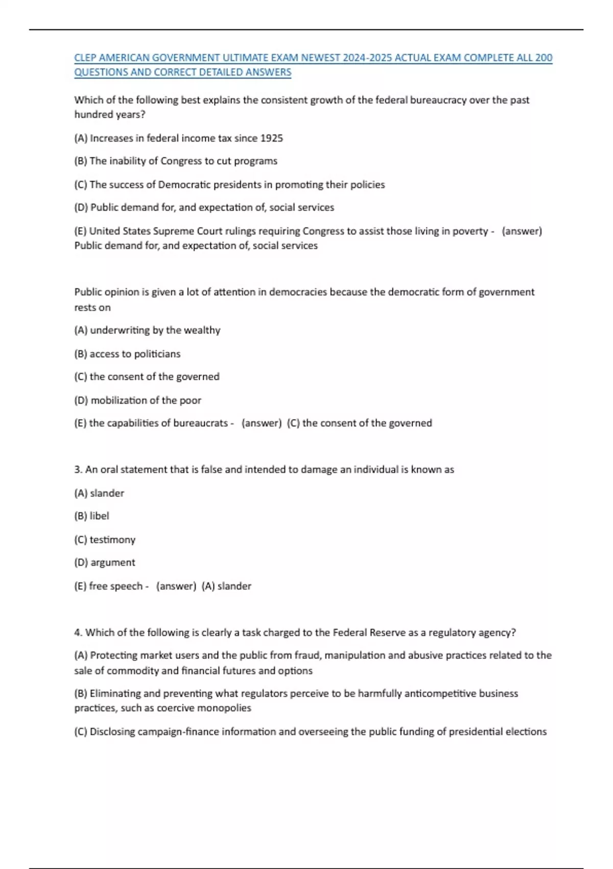 , CLEP AMERICAN GOVERNMENT ULTIMATE EXAM NEWEST 2024-2025 ACTUAL EXAM COMPLETE ALL 200