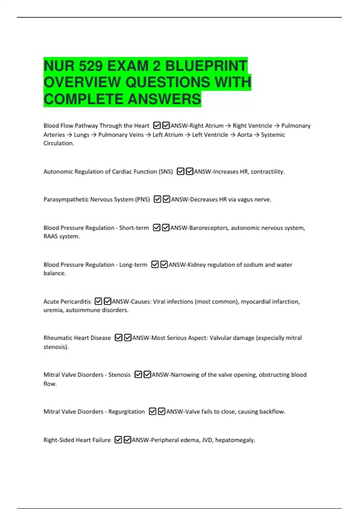 NUR 529 EXAM 2 BLUEPRINT OVERVIEW QUESTIONS WITH COMPLETE ANSWERS Blood Flow Pathway Through the Heart ANSW-Right Atrium → Right Ventricle → Pulmonary Arteries → Lungs → Pulmonary Veins → Left Atrium → Left Ventricle → Aorta → Systemic Circulation. Autonomic Regulation of Cardiac Function (SNS) ANSW-Increases HR, contractility. Parasympathetic Nervous System (PNS) ANSW-Decreases HR via vagus nerve. Blood Pressure Regulation - Short-term ANSW-Baroreceptors, autonomic nervous system, RAAS system.