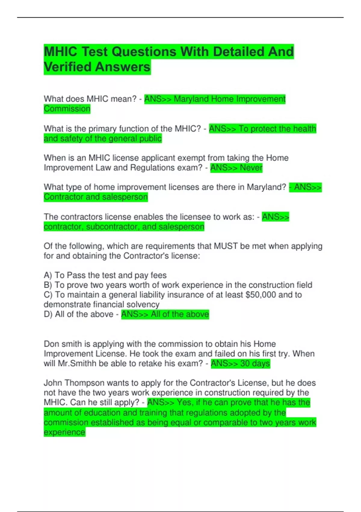 MHIC Test Questions With Detailed And Verified Answers What does MHIC mean? - ANS Maryland Home Improvement Commission What is the primary function of the MHIC? - ANS To protect the health and safety of the general public When is an MHIC license applicant exempt from taking the Home Improvement Law and Regulations exam? - ANS Never What type of home improvement licenses are there in Maryland? - ANS Contractor and salesperson The contractors license enables the licensee to work as: - ANS contractor, subcontractor, and salesperson Of the following, which are requirements that MUST be met when applying for and obtaining the Contractor's license: A) To Pass the test and pay fees B) To prove two years worth of work experience in the construction field C) To maintain a general liability insurance of at least $50,000 and to demonstrate financial solvency D) All of the above - ANS All of the above Don smith is applying with the commission to obtain his Home Improvement License. He took the exam and failed on his first try. When will Mr.Smithh be able to retake his exam? - ANS 30 days John Thompson wants to apply for the Contractor's License, but he does not have the two years work experience in construction required by the MHIC. Can he still apply? - ANS Yes, if he can prove that he has the amount of education and training that regulations adopted by the commission established as being equal or comparable to two years work experience