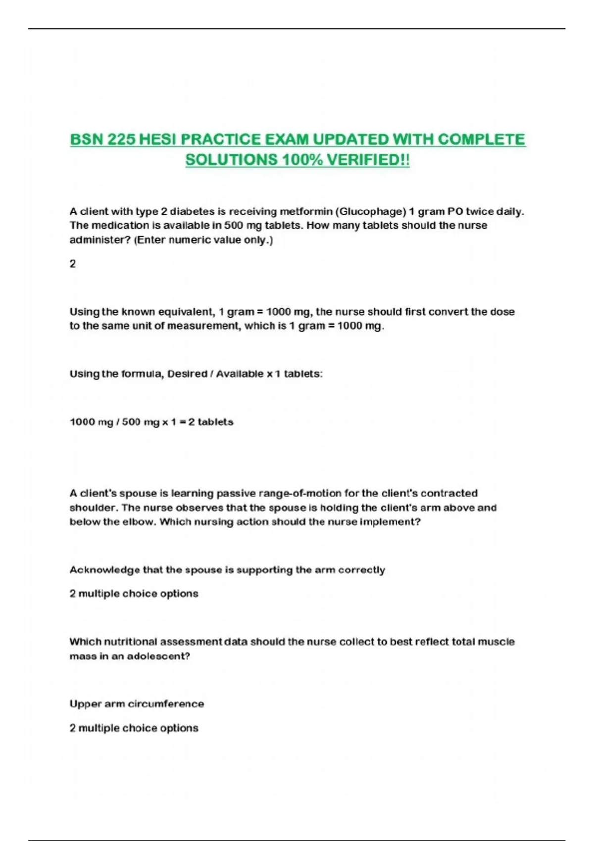 BSN 225 HESI PRACTICE EXAM UPDATED WITH COMPLETE SOLUTIONS 100% VERIFIED!!...