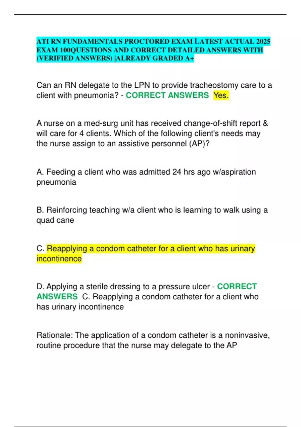 ANSWERS C. Reapplying a condom catheter for a client who