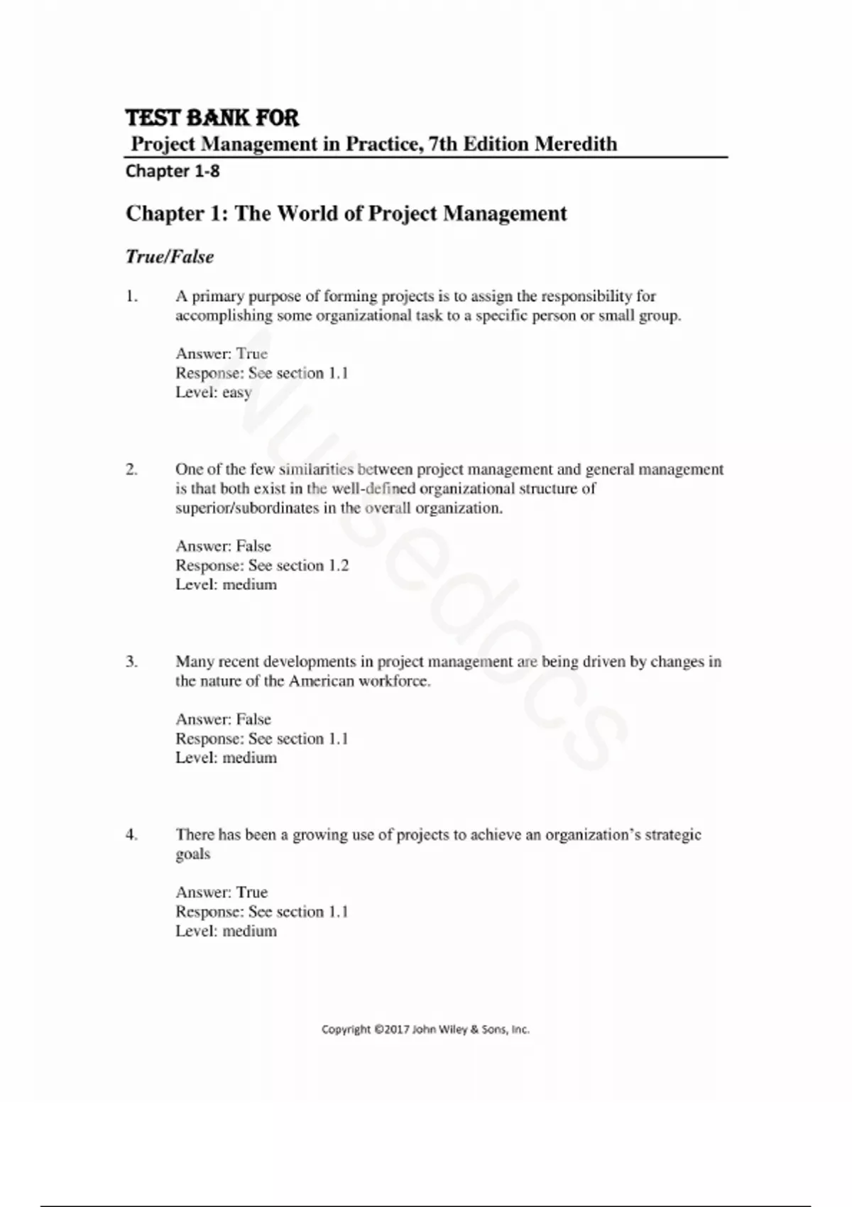 TEST BANK For Project Management in Practice, 7th Edition by Jack R. Meredith, Verified All Chapters 1 - 8, Complete Newest Version|Rated A+
