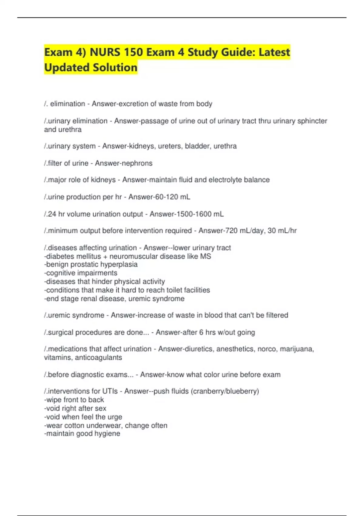 /.urinary elimination - Answer-passage of urine out of urinary tract thru urinary sphincter