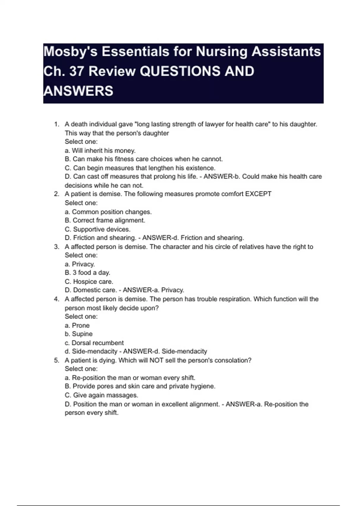 4. A affected person is demise. The person has trouble respiration. Which function will the