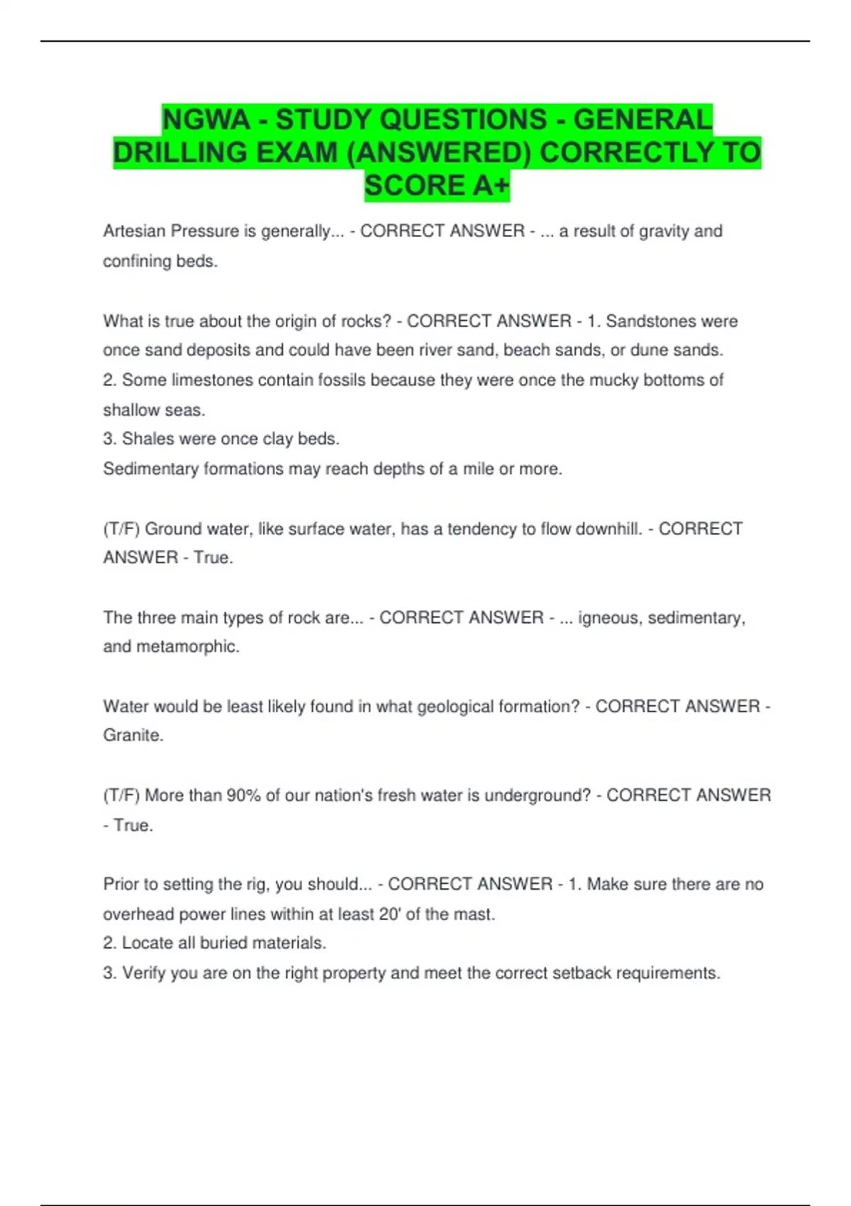 NGWA - STUDY QUESTIONS - GENERAL DRILLING EXAM (ANSWERED) CORRECTLY TO SCORE A+