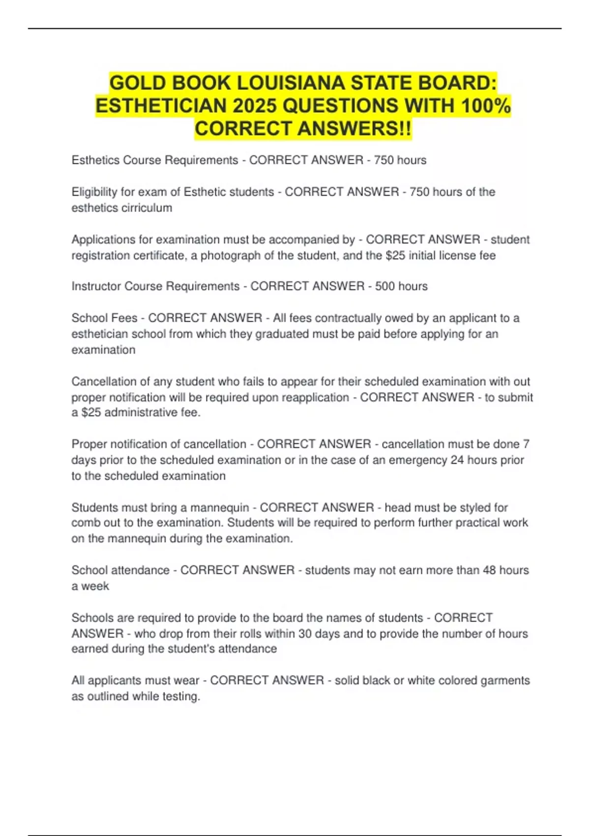 ESTHETICIAN 2025 QUESTIONS WITH 100%